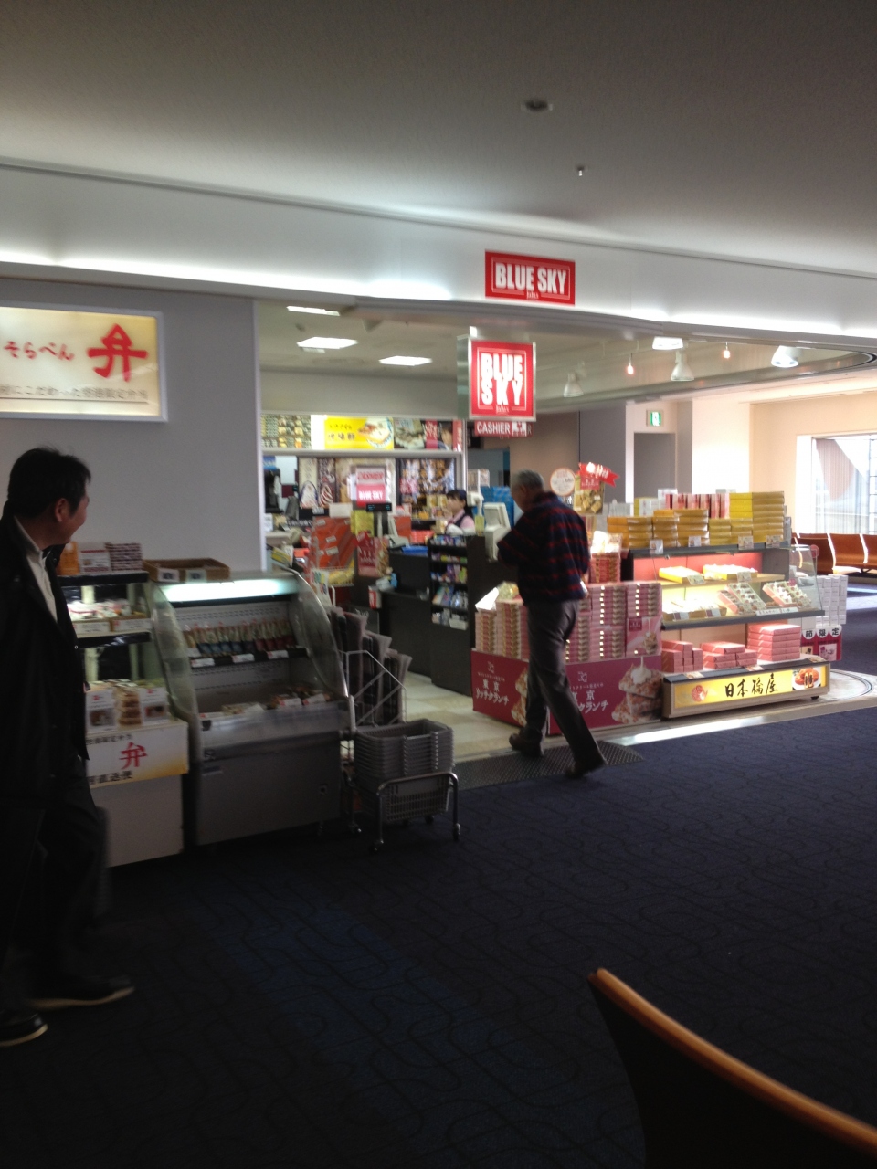 ブルースカイは、羽田空港 第1旅客ターミナルビル2階出発11番ゲート前に有ります。ここでは、東京のお土産として東京ばな奈が置いて有って、買い忘れた際にお勧めとなります。また、ドリンクやサンドイッチも置いてます。ぜひ、一度、よってみてください