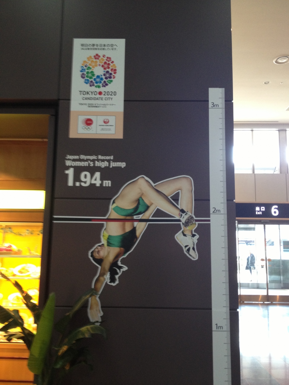 羽田空港ターミナル ビッグバードでは、東京オリンピック招致に向け、いたるところに各種目についての記録を記載し、気分を盛り上げるべく一生けん命に取り組んでいます。写真は、女子高跳びですね。ぜひ、色々な場所で見る事ができます,