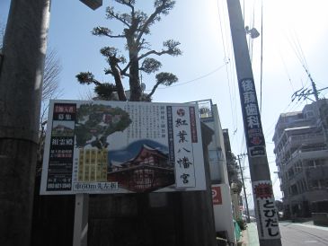案内表示に沿って歩くと途中から住宅街のようになり手前には高取焼きの窯元があります。そこからすぐ鳥居がみえ紅葉八幡です。徒歩約6分です。