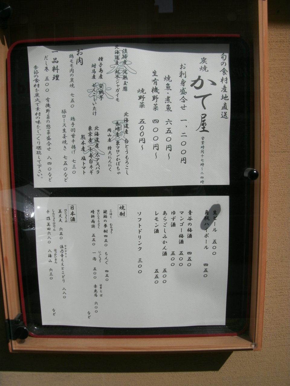 「かて屋」さんは、長岡天神駅西口より徒歩で3分、駅南側の踏み切りのそばにあります。20人も入ればいっぱいになる小さな居酒屋さんですが、産地直送の魚介や野菜、お肉を炭火で焼いたものをリーズナブルに頂けるので人気があります。コースもありますが、その日のお奨めの刺身や焼き魚、煮魚、焼き野菜などを頂くのが楽しい店です。
