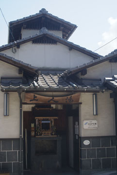 よね田でだんご汁を食べた後、両側に地獄やあやしい秘宝館が並んでいますが、観光地化されているのでパスして、みゆき坂を下ってバス通りを越えてすぐのところに上人の湯があります。いかにも共同風呂といった外観で、近くの喫茶店で100円払って木札を借りて入ります。