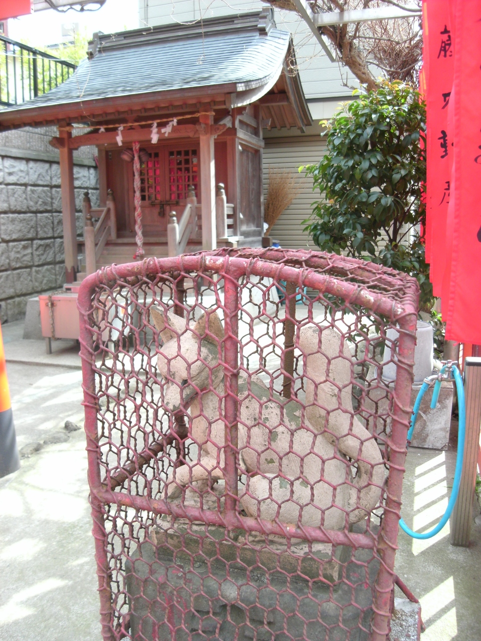 町内の守り神なのでしょう。町内会館と一緒です。小さな神社ですが、セキュリティされているのが面白い。狐像に金網がかけられている。
