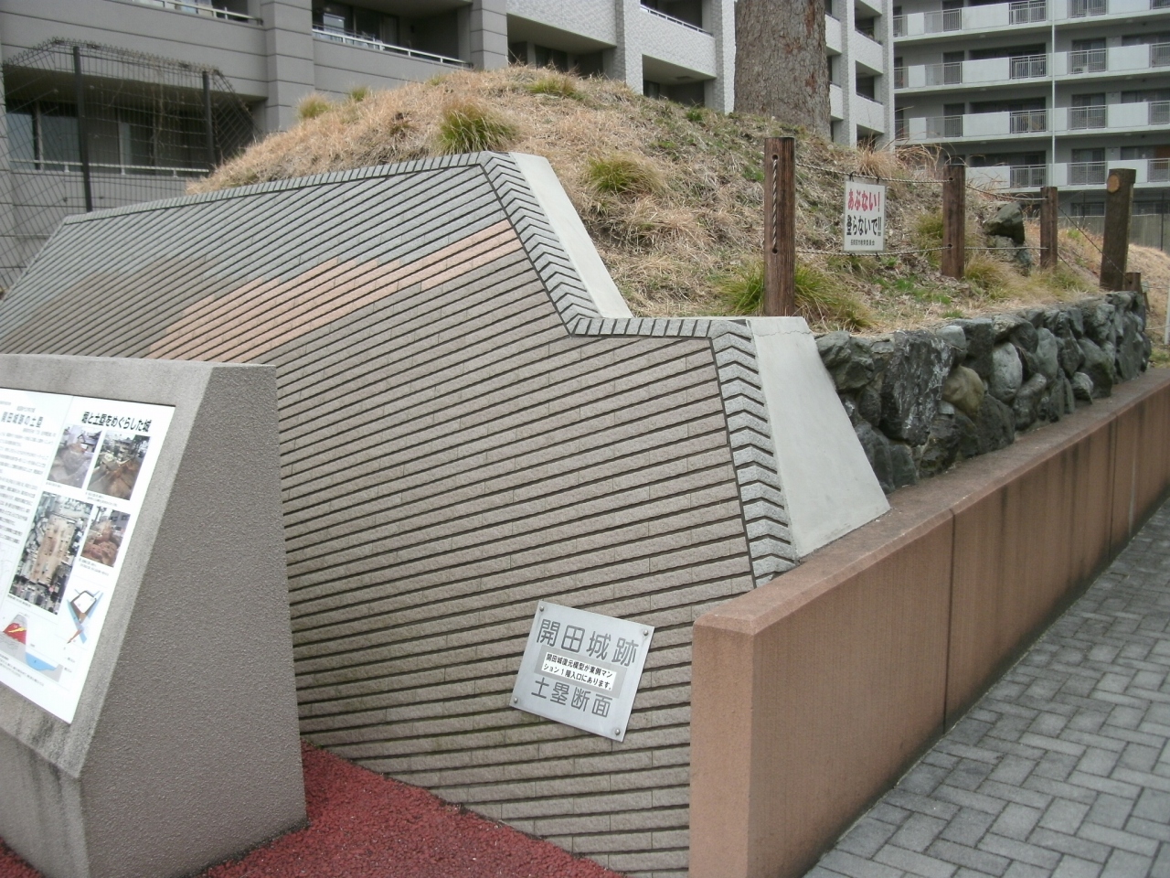 「開田城跡」は、阪急長岡天神駅の西側約100m程の所にある阪急バス開田バス停の傍にあります。開田城は、戦国時代にこの地域を領した土豪である中小路氏によって築かれたもので、約70m四方方形の縄張りで周囲に土塁と堀を構築していたそうです。 現在、開田バス停西側に“開田城土塁公園”として城の西辺の土塁(一部復元)が保存されています。現地にあった案内板によれば、土塁の東側のマンションのエントランスに開田城の復元模型が展示されていて誰でも見学可能です。