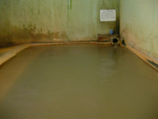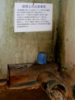 浴室内はそれほど広くなく奥から源泉が掛け流されて、ここも床が沈殿物で茶色に染まっています。温泉は、ナトリウム-マグネシウム-カルシウム-炭酸水素塩泉とのことで、ながの湯より白く、カルシウム分が多い気がします。源泉毎に微妙に成分が違うのは、長湯温泉の面白いところです。源泉にコップがあり、奥に飲用上の注意が書いてあります。