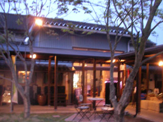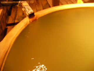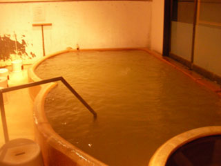 そろそ夕闇がせまって風情ある庭を通って奥にあるフロントがあり、廊下を通って温泉のある建物に向かいます。浴室は、中央に大きな浴槽があり、高めの源泉が掛け流されています。浴槽の底は、温泉成分の析出物がたまってザラザラしていて、源泉の濃さが分かります。源泉から離れると湯温が少し低くなり、溢れた湯は、樋を通って外にある温めの露天風呂に流れて行きます。屋内には、もうひとつ円形の水風呂があり、中央から炭酸の泡が昇っていて、体じゅうも炭酸の泡に包まれます。高温の源泉と、中温の露天風呂、泡の水風呂の間だを何度も往復して、炭酸泉を堪能しました。