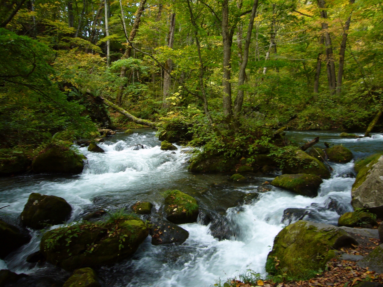 弘前から奥入瀬渓流に向かう途中、昨日登った八甲田山は初冠雪。昨日の頂上は寒かったわけだ。奥入瀬渓流は景色的には、子ノ口よりも焼山から登るのが良いとの情報を得たので、焼山の観光案内所に車を停め、観光マップを入手。え〜!! 14?も歩くのかい?あれ〜車で入っているじゃない。何と、ここも、八幡平と同様、来週からマイカー規制、ラッキー!!! ここ奥入瀬渓流は、青森県十和田市十和田湖畔子ノ口から焼山までの約14kmの奥入瀬川の渓流であり、渓流沿いにはいくつもの滝が点在し、この道は「瀑布街道」とも呼ばれている。十和田湖への魚の遡上を阻止してきた魚止めの滝でもある銚子大滝をはじめとして、阿修羅の流れ、雲井の滝等多くの景勝地がある。しかし、道幅が狭く、また、観光バスまでも路駐し、ゆっくりと見学するというより、通り抜けたという感想。道路すれすれまで水かさがある所もあり、大雨の時にはどうなるのかな?ということで、あっという間の奥入瀬渓流観光。