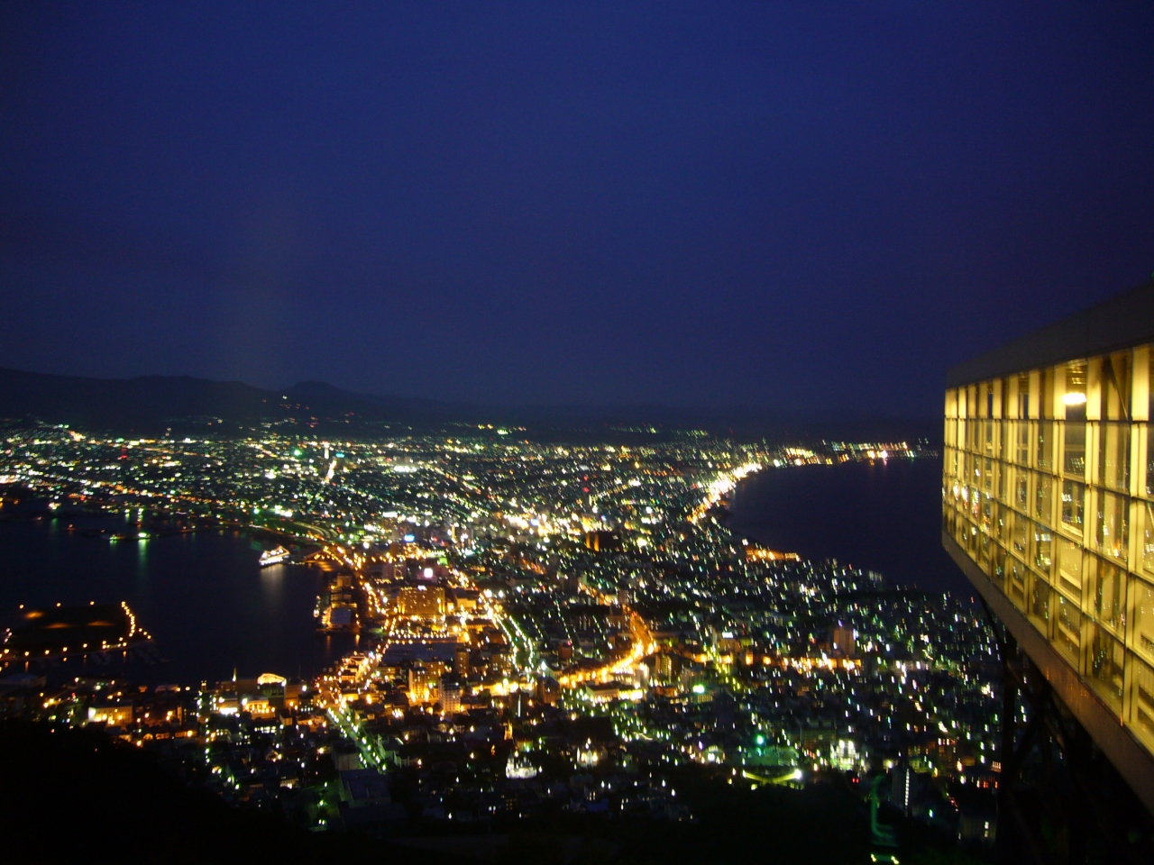 標高334m、津軽海峡に突き出し、函館市街を見下ろす位置にあるのが、函館山。函館山からの夜景は、ナポリ、香港と並ぶ世界三大夜景だ。この夜景を楽しむのに便利なのが、山麓と山頂を秒速7秒、約3分で結ぶ、函館山ロープウェイ。山頂駅と直結した展望台からは昼間は函館市街のほか駒ヶ岳や津軽海峡、下北半島まで見渡すことができる。また、夜には宝石を散りばめたような美しい夜景が眼下に広がり見る人を魅了する。登った時点では、まだまだ明るかったので、併設のレストランで暗くなるまで食事を楽しんだ。