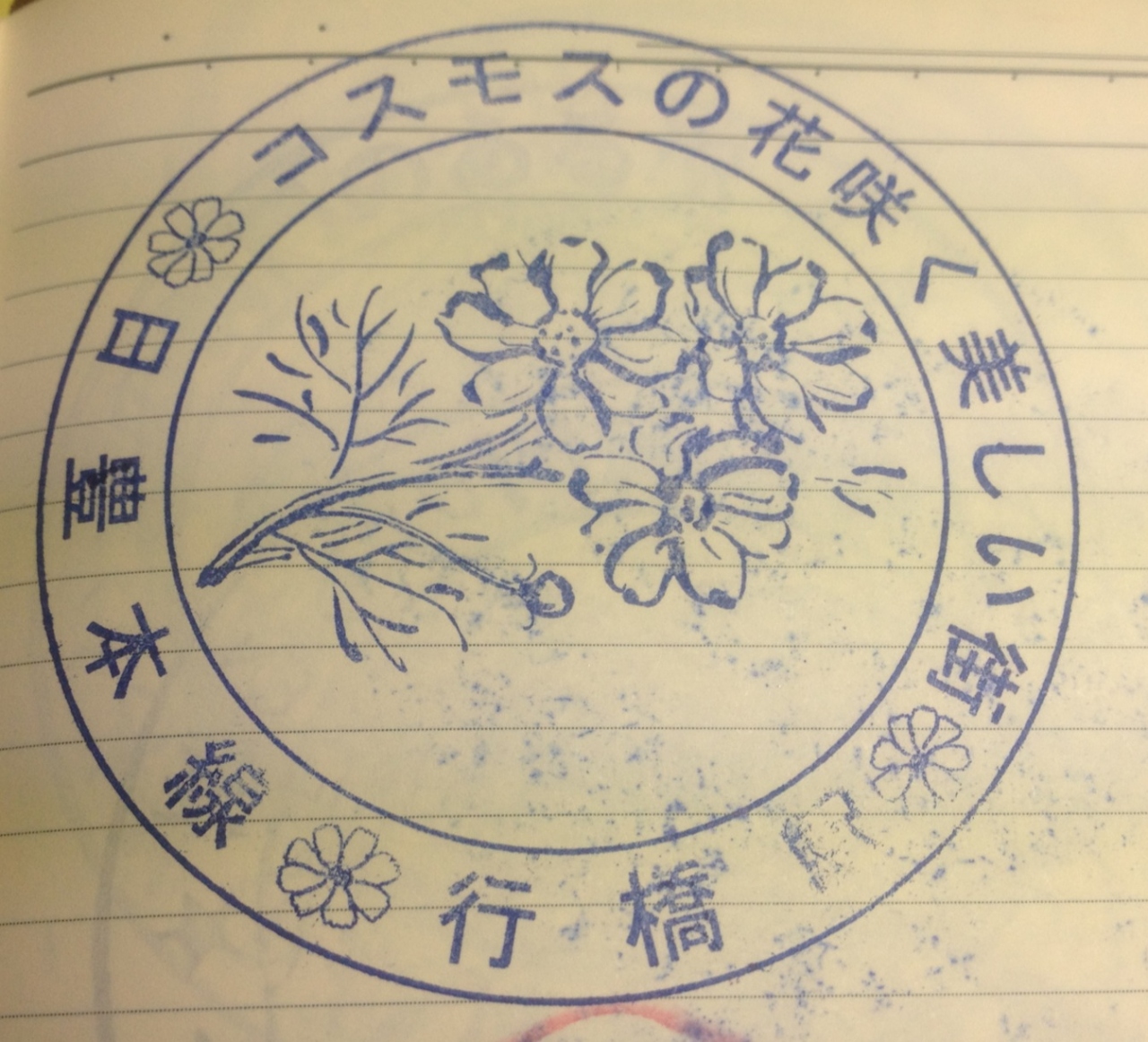 行橋駅のスタンプには、「コスモスの花咲く美しい街」と刻印されています。