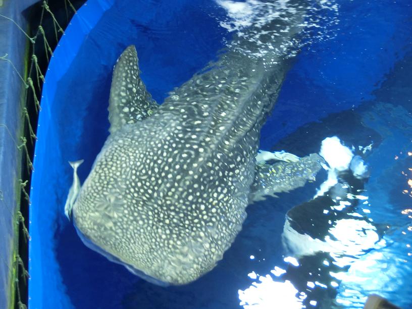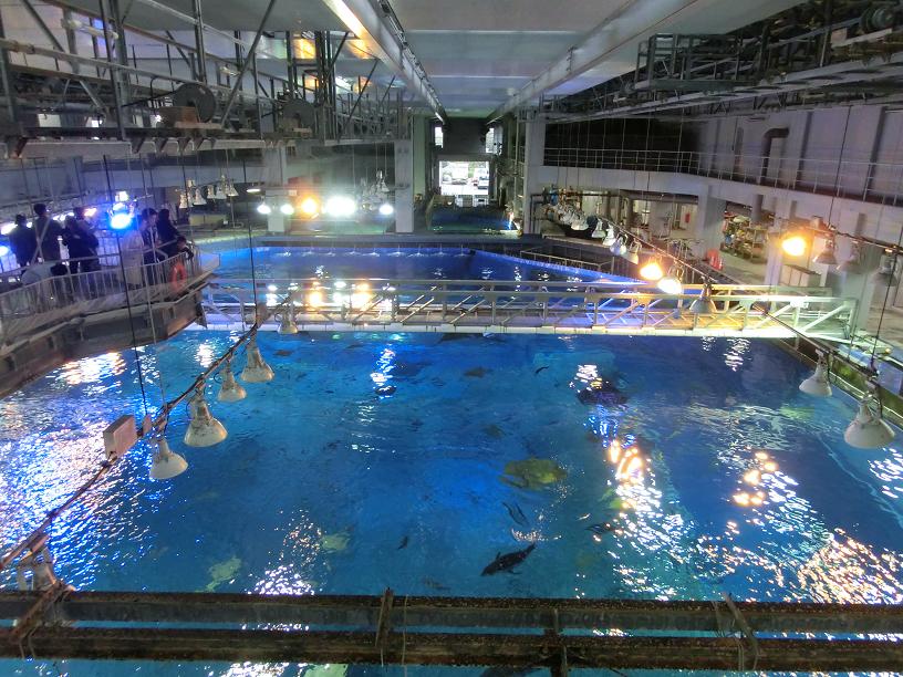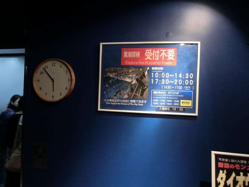 大水槽を上から見ることのできる黒潮探検というルートを通ってみました。一種のバックヤードツアーですが予約無しで入れます。エレベーターで4階まで上がるので17時30分ころにはエレベータ待ちの列ができていました。降りた頃には少し時間が経っていたので列もなくなっていました。
