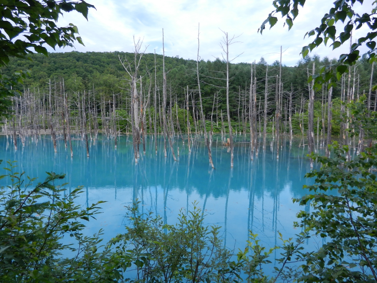 最近ガイドブックに取り上げられてますね、青い池。本当に青いのかなと半信半疑で、試しに行ってみました。駐車場は砂利ですが広くて混んでいても停められました。そこから少し歩きますが、本当に青い池が見えてきます。青い水から白い木が生えていて、それが映えてキレイです。するとウエディングドレスとタキシードのカップルがカメラマンに写真を撮ってもらっていました。とってもキレイなところなので、ウエディングの撮影場所にも採用されているんですね。