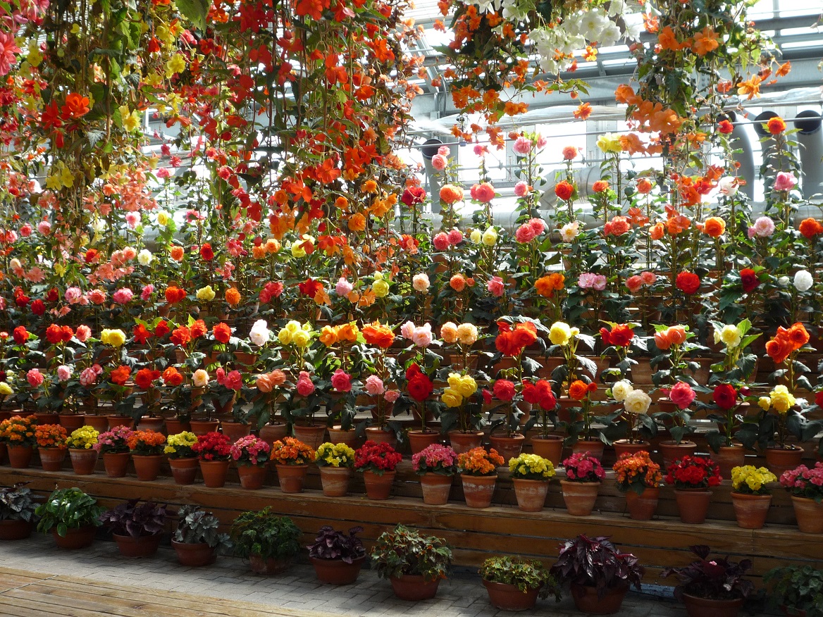 温室の作りになっており、内部は所狭しと咲いているベゴニアに圧倒されます。花の色も千差万別で、見事の一言です。上から吊るしているベゴニアは、自宅でも育ててみたいと思うくらいにかっこいいです