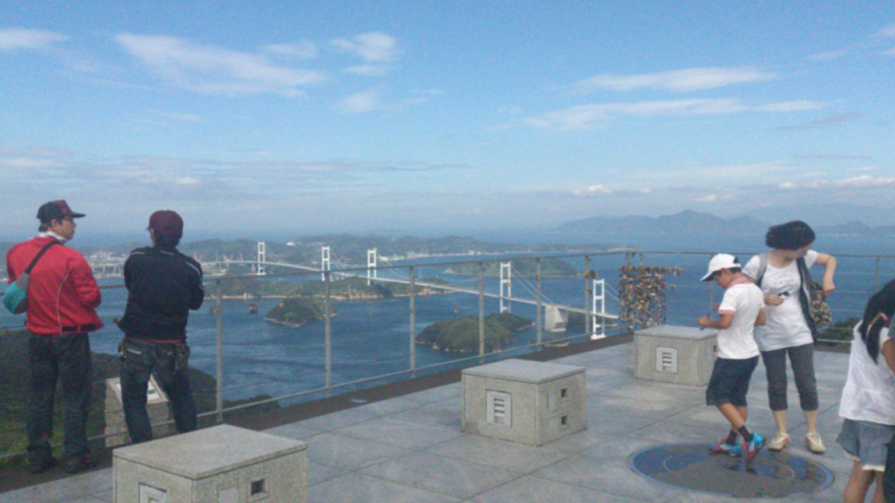 今治からしまなみ海道に入って一つ目の島にあります。山の上まで車で上っていくと、展望台から四国と瀬戸内海、そして連なる橋を見ることができます。かなりの見ごたえです。最近の流行なのか、手すりに南京錠がかかっているところもありました。カップルにもオススメです。何にせよ、しまなみ海道に行くことがあれば、必ず行くべきところだと思います。