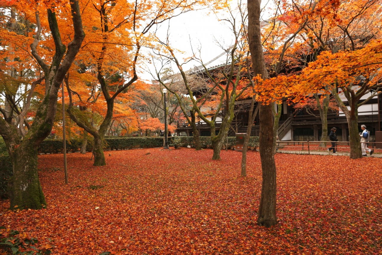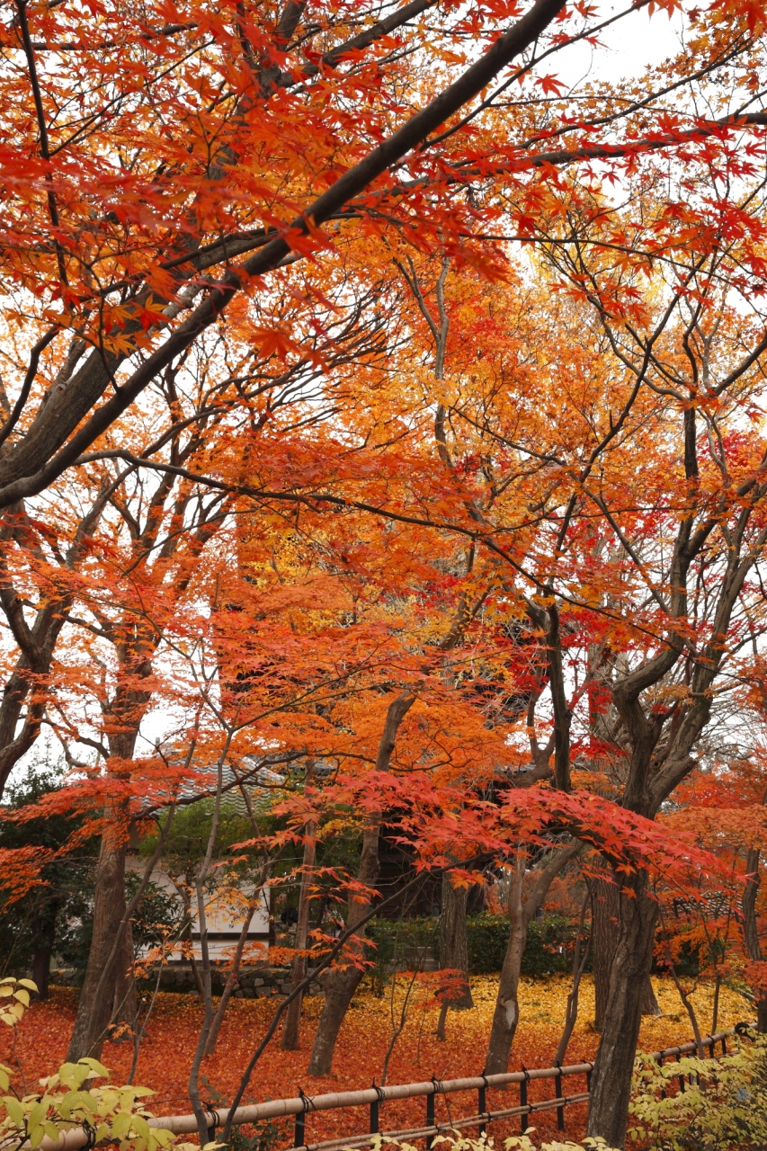12月に入ってしまった紅葉狩り。洛東エリアに狙いを定めて友人と向かい、真如堂前のバス停で思いつきで降車して立ち寄ったのですが、期待以上に綺麗な紅葉を見せてくれました。さすがにこの時期では、すっかり落葉して枝だけになった木の方が多いくらいでしたが、生垣で囲った庭の一部で、見事な散紅葉を見ることが出来ました。