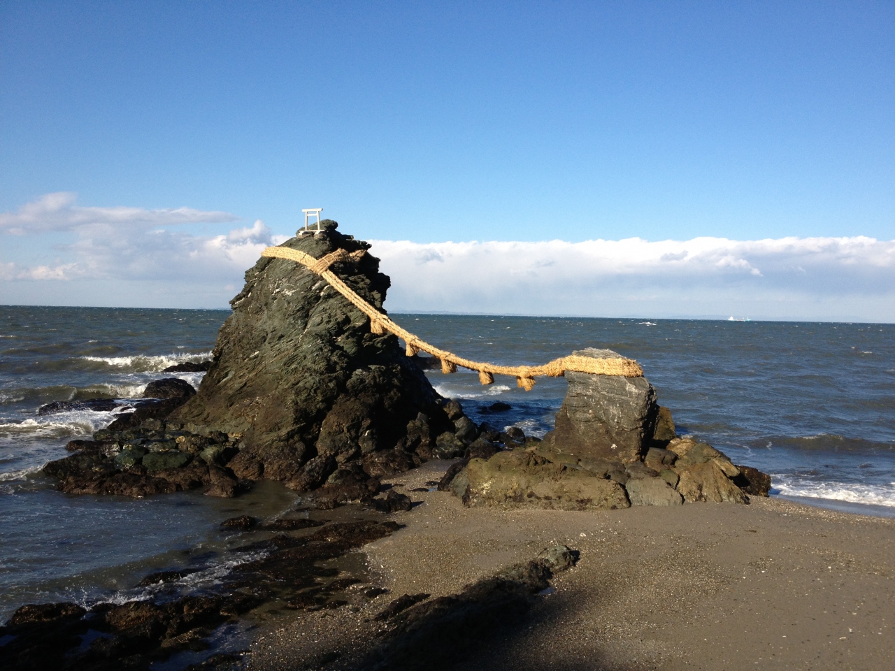 小学校の修学旅行で行きました。当時の子供心でも「想像より小っちゃいなぁ」と感じ拍子抜けした記憶があります。数キロ沖に大きな岩がドーンという感じを想像していくと「近っ!小っちゃ!」感じます。とは言え、夫婦円満のシンボルなので是非行って欲しい場所です。