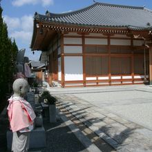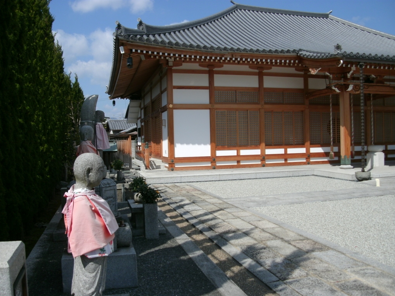 「地蔵寺」さんは、阪急桂駅の東、300mあまり、府道142号線(旧山陰街道)に面したところにあります。浄土宗の寺で、桂地蔵寺といい、京都六地蔵巡りの霊場の一つです。 本尊の地蔵尊は、平安時代の初期に、参議小野篁(おののたかむら)が、一度、息絶えて冥土へ往き、生身の地蔵尊を拝してよみがえったのち、一木より刻んだ六体の地蔵菩薩の一つであるといわれています。古い本堂は2007年春に解体され、現在は新しい本堂になっており、手入れの行き届いた庭には地蔵様が安置されていました。