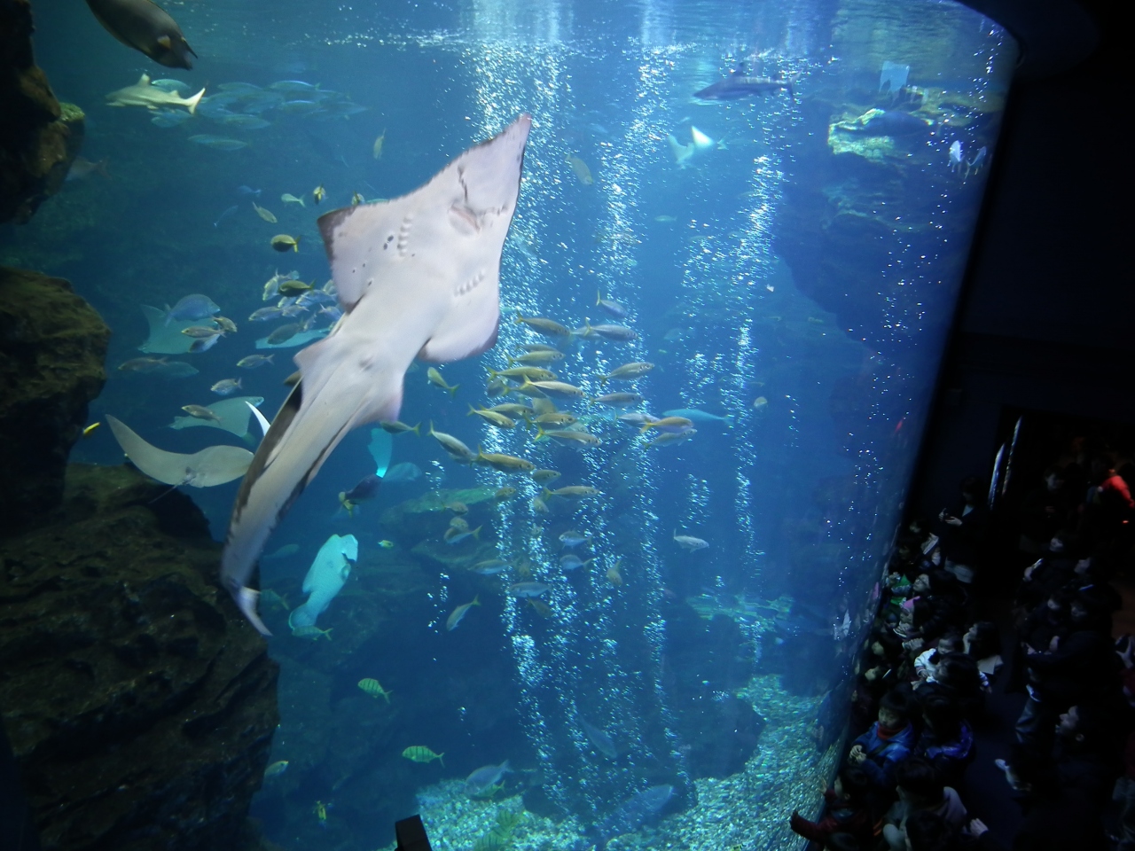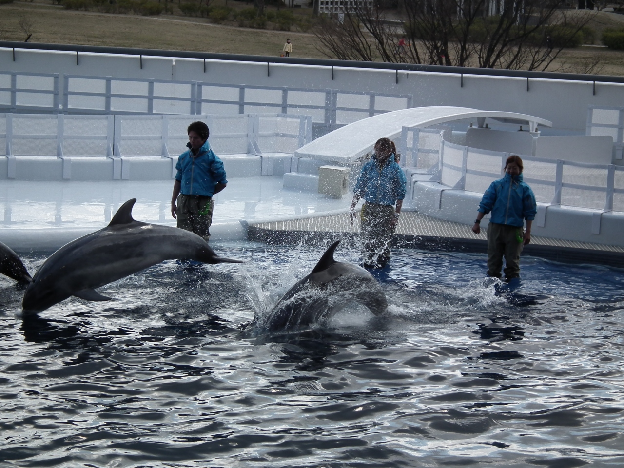 京都駅に近い梅小路公園の一角にある京都水族館へ行ってきました。公園の西にある駐車場に車を止め、京都に水族館なんて似合わないなんて思って行きましたがやっぱり似合ってはいませんでした。施設は新しいだけにきれいで快適でした。建物は京都らしい低い建物で、太陽の光を沢山取り入れたエコな工夫が多く見受けられました。生き物たちとの「ふれあい」がテーマとなりますがそこは良かったです。しかし、イルカスタジアムの観客席から見た景色、手前からイルカのプール、梅小路公園の芝生広場、奥にJR在来線と新幹線、その向こうに東寺の五重塔と、似合っていませんでした。