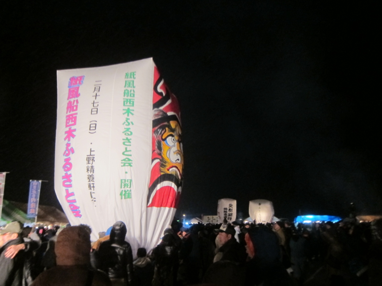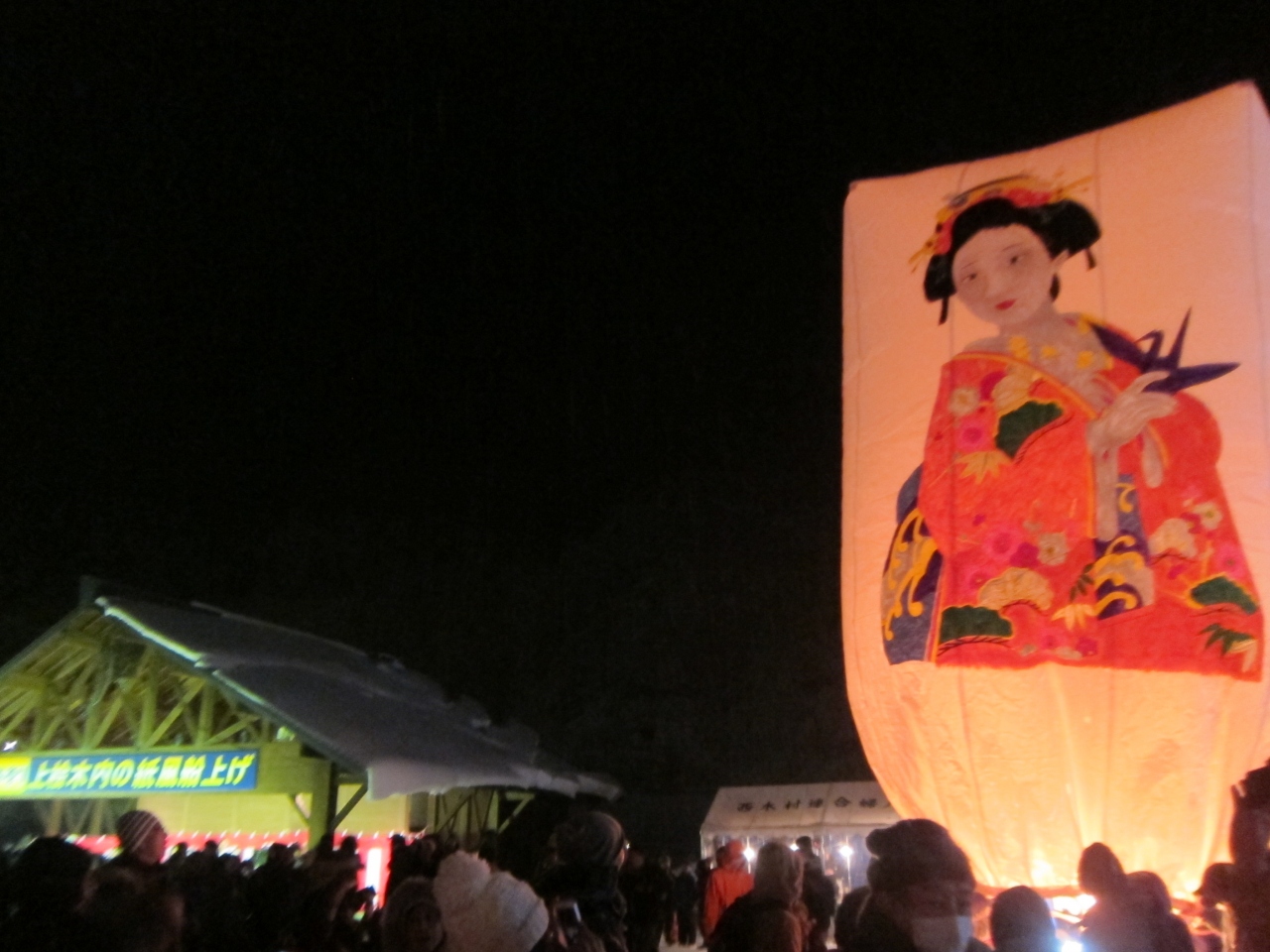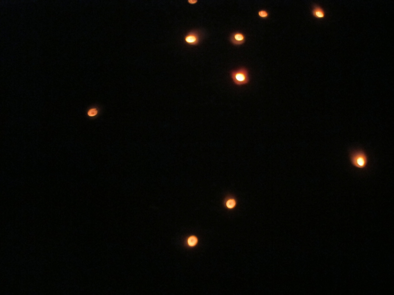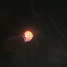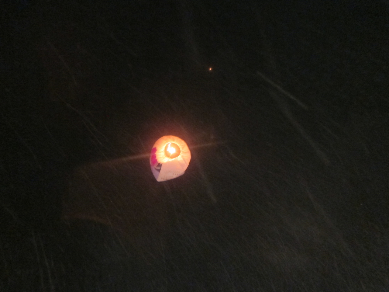 いくつもの明るい紙風船が夜空高く上がるのは幻想的ですが、いくつかは燃えながら民家の上などに落ちていくものもありました。