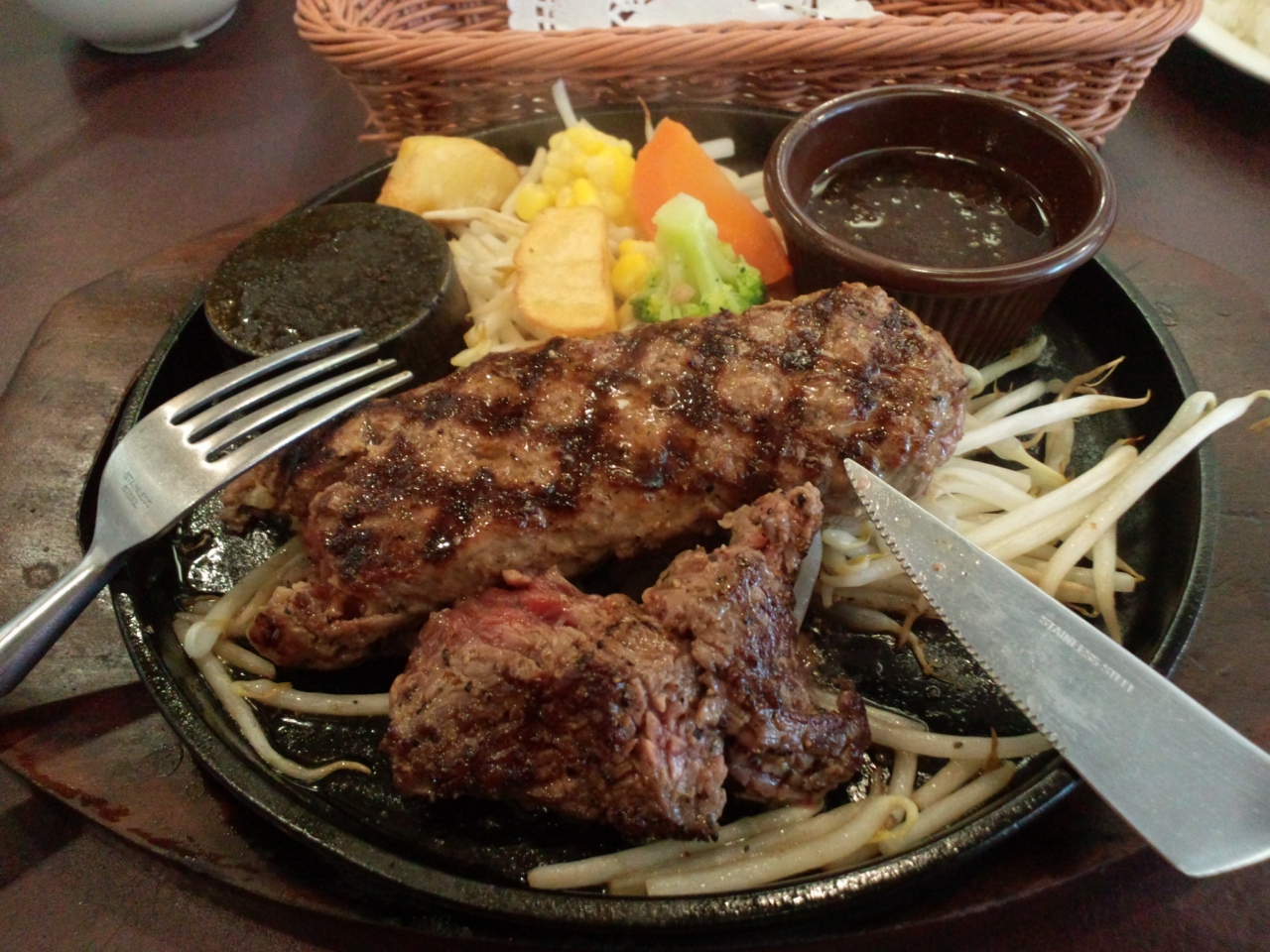 食べたのは弾力バーグ&熟成牛カットステーキ1554円。