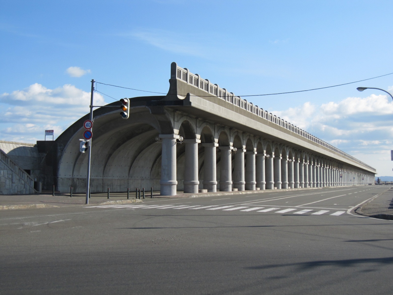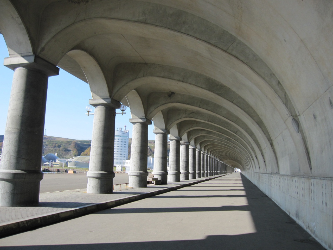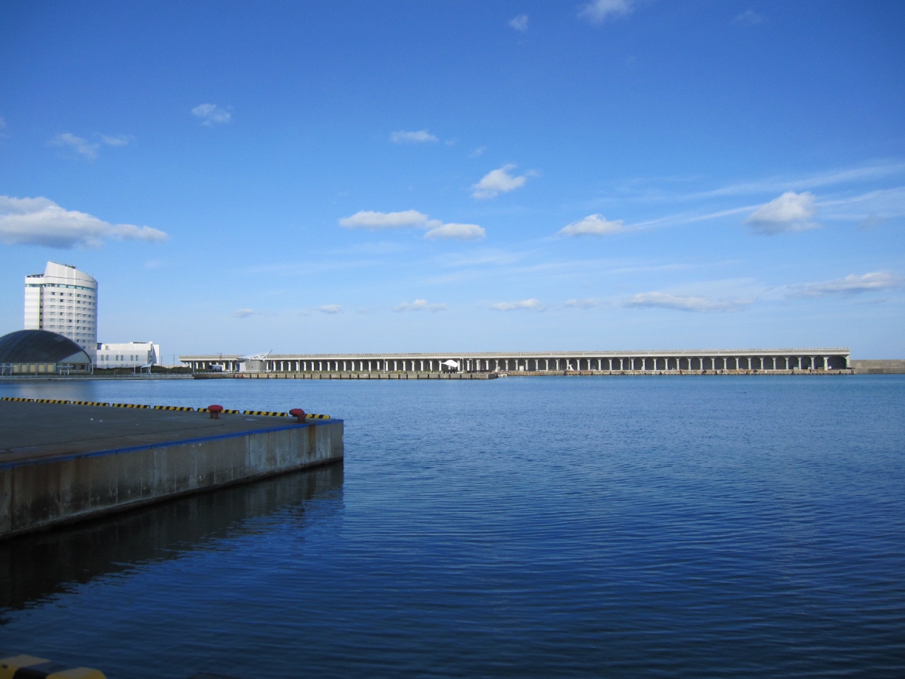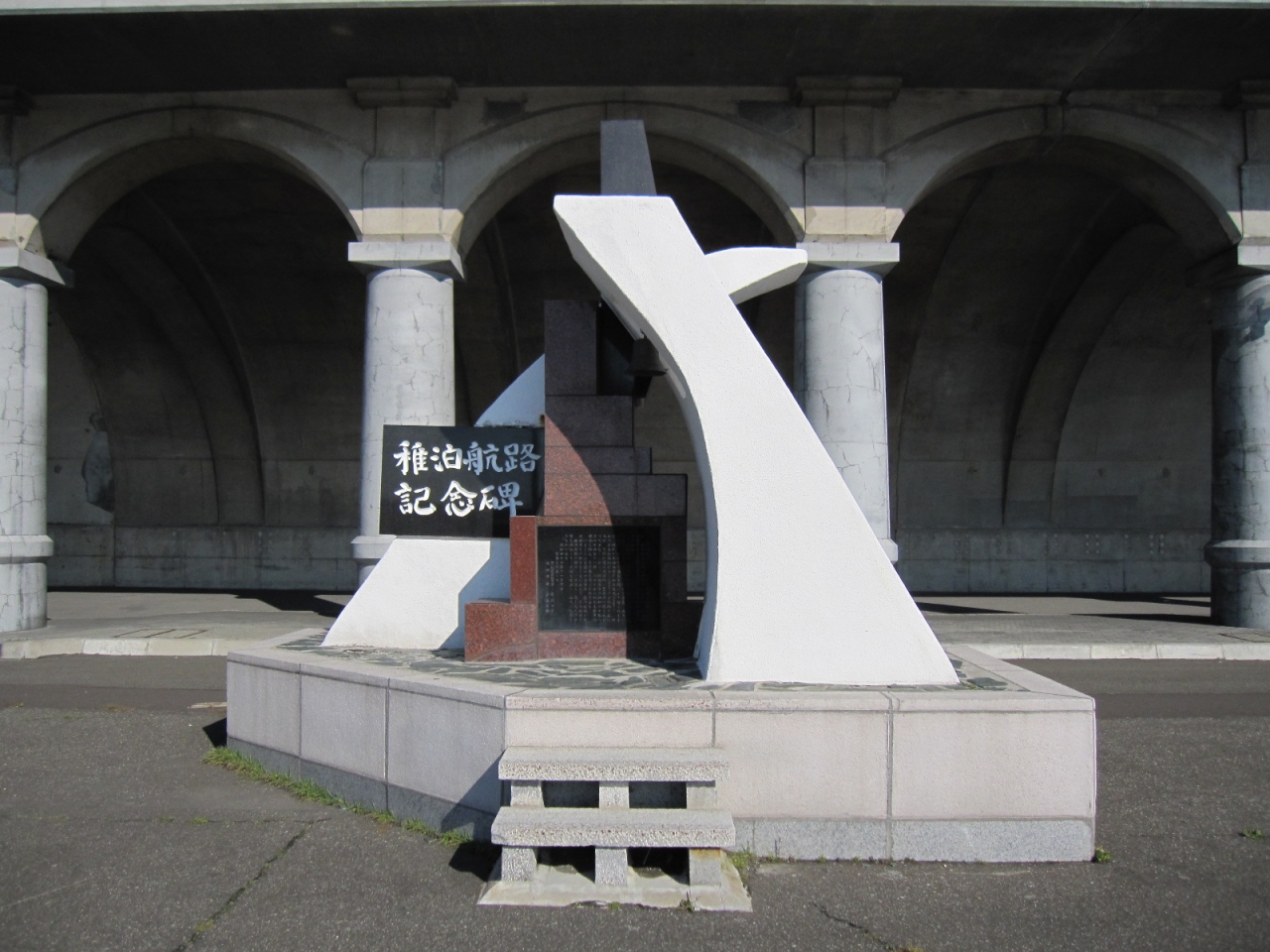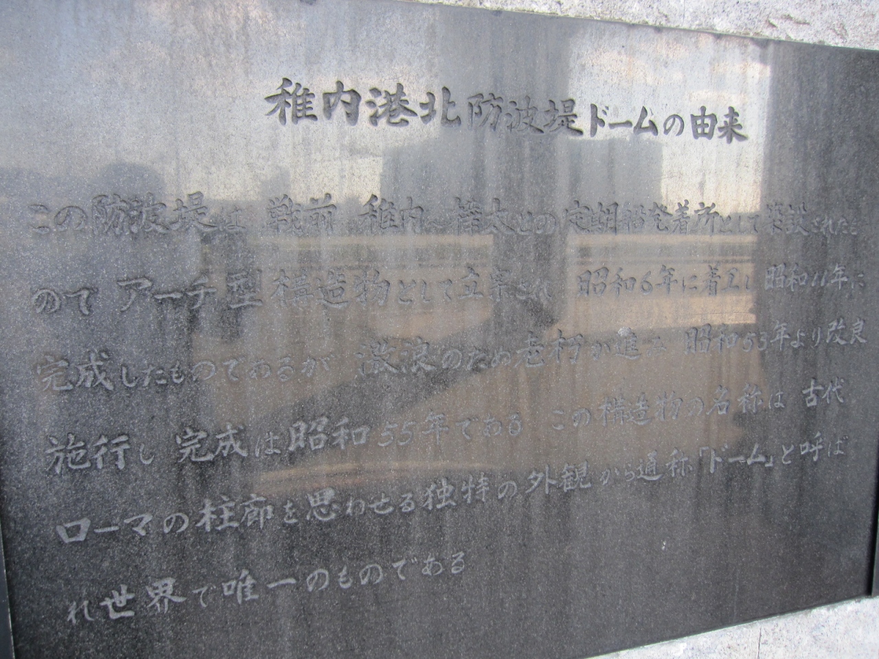 JR稚内駅から全日空ホテル方面に約10分歩くとある稚内では有名な防波堤です。戦前の樺太定期航路の発着場であった場所にあり、昭和11年に完成し、その後老朽化したので昭和53年~55年に改修を受けたと石碑に刻まれていました。ドームの向こうの海は見えず、前側には芝生と野外ステージの有る広場になっていますし、港の周りもきれいに整備されているので散歩をするにはよい場所でした。