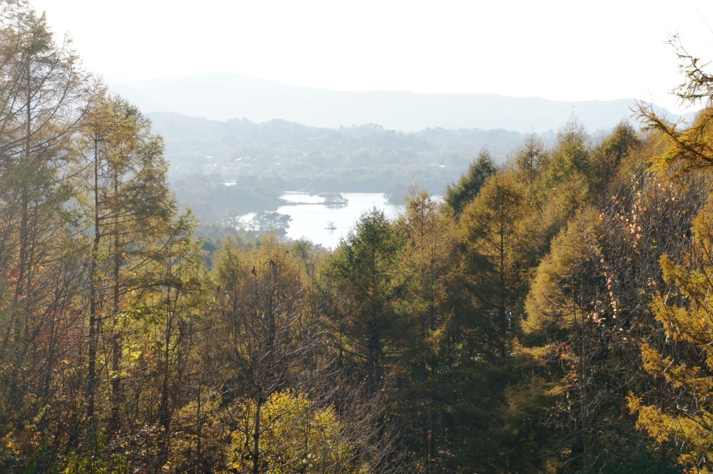 裏磐梯3湖の一つ、小野川湖を真正面で見下ろすことができるのが、磐梯吾妻レークラインの涼風峠です。標高約870メートル。道路沿いにある広めの駐車スペースに車を停めて、湖ウオッチング。青く輝く湖面、浮かぶ大小の島々のコントラスト−なーんてパンフには書いてあったけど、残念ながら西日が当たる夕方だと、かすんでよく見えませんでした。
