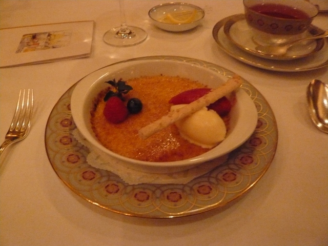自家製のスモークサーモン・温野菜とお肉の味が楽しめるかわいい球形のコロッケ風のお料理・野菜たっぷりのコンソメスープ・メインはお肉かお魚どちらかを選択。鯛の焦がしバターソースにしました。お料理の量はどれも丁度よく、おいしかったです。デザートが数種類の中から選べるのがうれしい。しかもどのデザートも食べたくなります。