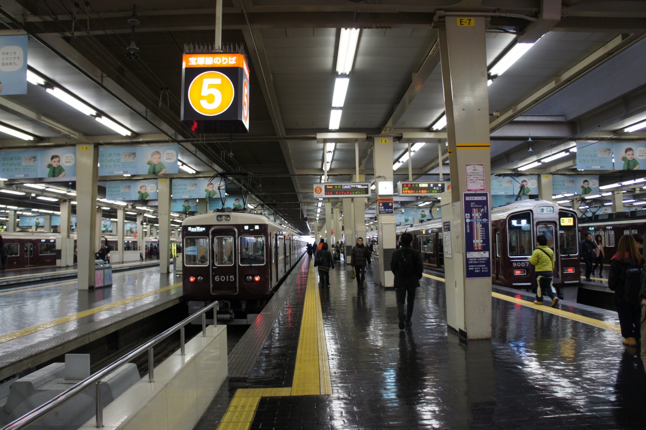 阪急の梅田駅は、京都線、宝塚線、神戸線が出ていて、まさにターミナル駅。引き込み線となった始発駅なので、ヨーロッパの駅のよう。東京にはこうした駅はないですね。10番線くらいまであって、構内は景観としても、壮観です。