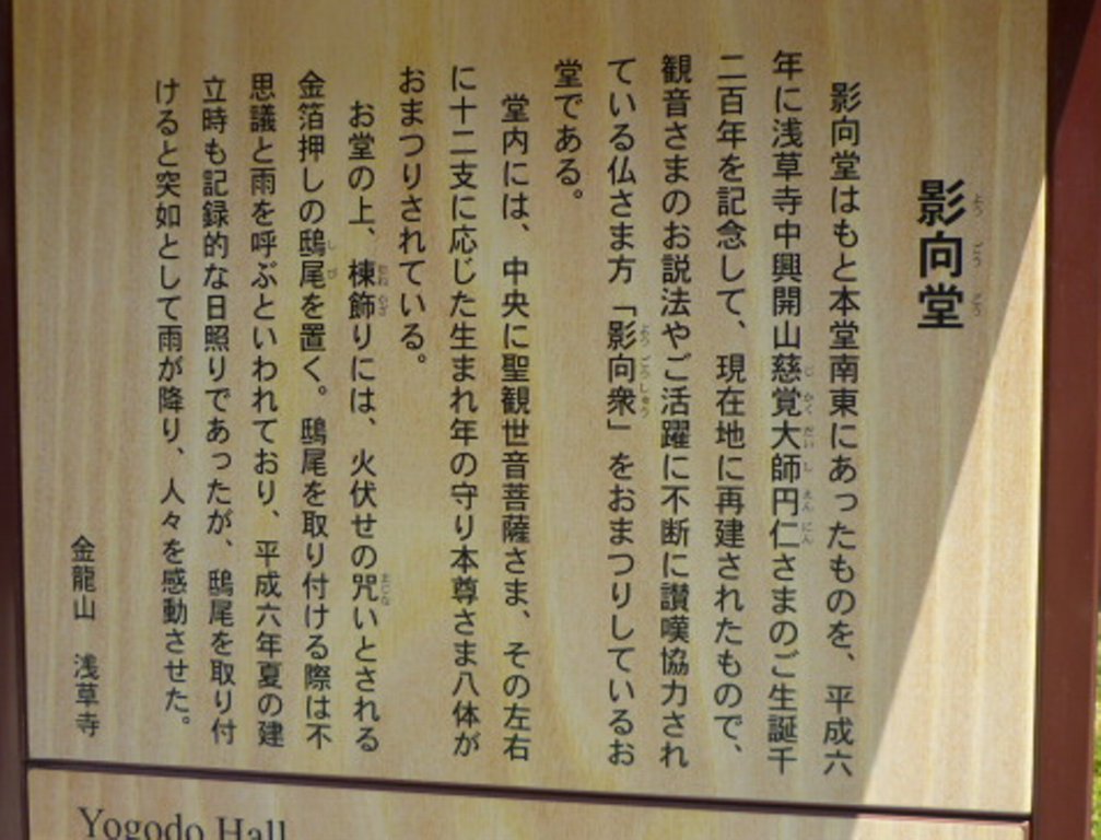 観音さまのお説法やご活躍に不断に協力されている仏さま方を影向衆とお呼びし、これらの仏さまをおまつりするお堂なんだそうです。浅草寺の御朱印所で、大黒天のご朱印も堂内が頂けるです。大黒天には台所の神なんですね。しかも日本では無くインドです。大黒天は、ヒンドゥー教の主神の一つシヴァ神の化身なんだそうです。