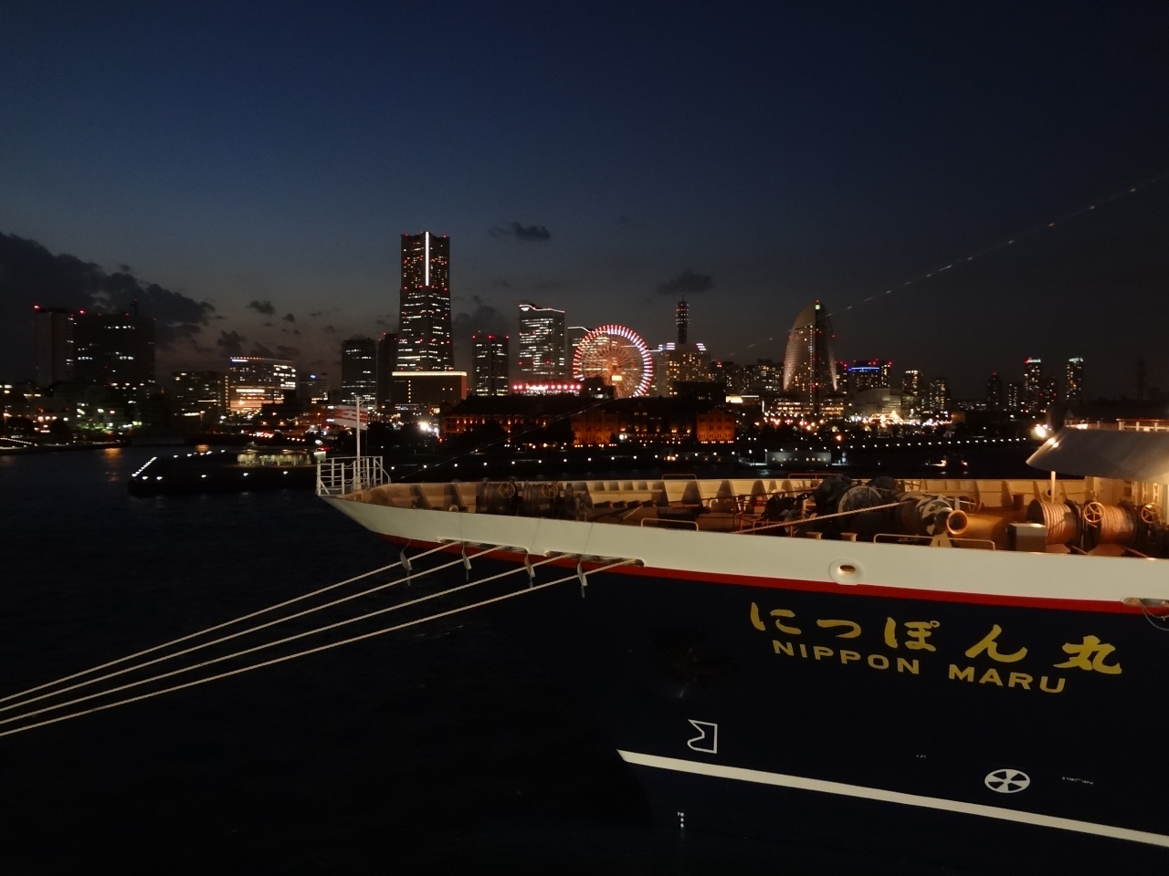 今回は、暗くなってから出かけたのですが、客船越しに見える「みなとみらい地区」の夜景は大変美しいです。