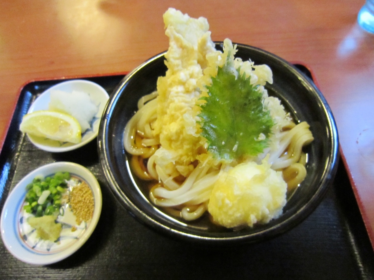 かき揚げおろしうどんもかなり大きめのかき揚げが入っていて、親子天うどんは鳥天が5個と半熟卵天、大葉天が入っていてかなりボリューミーでした。