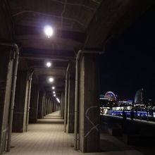 夜にこのプロムナードを通って赤レンガまで行きましたが、右手に大さん橋、左手にはみなとみらい地区の夜景と、とにかく景観が素晴らしかったです。