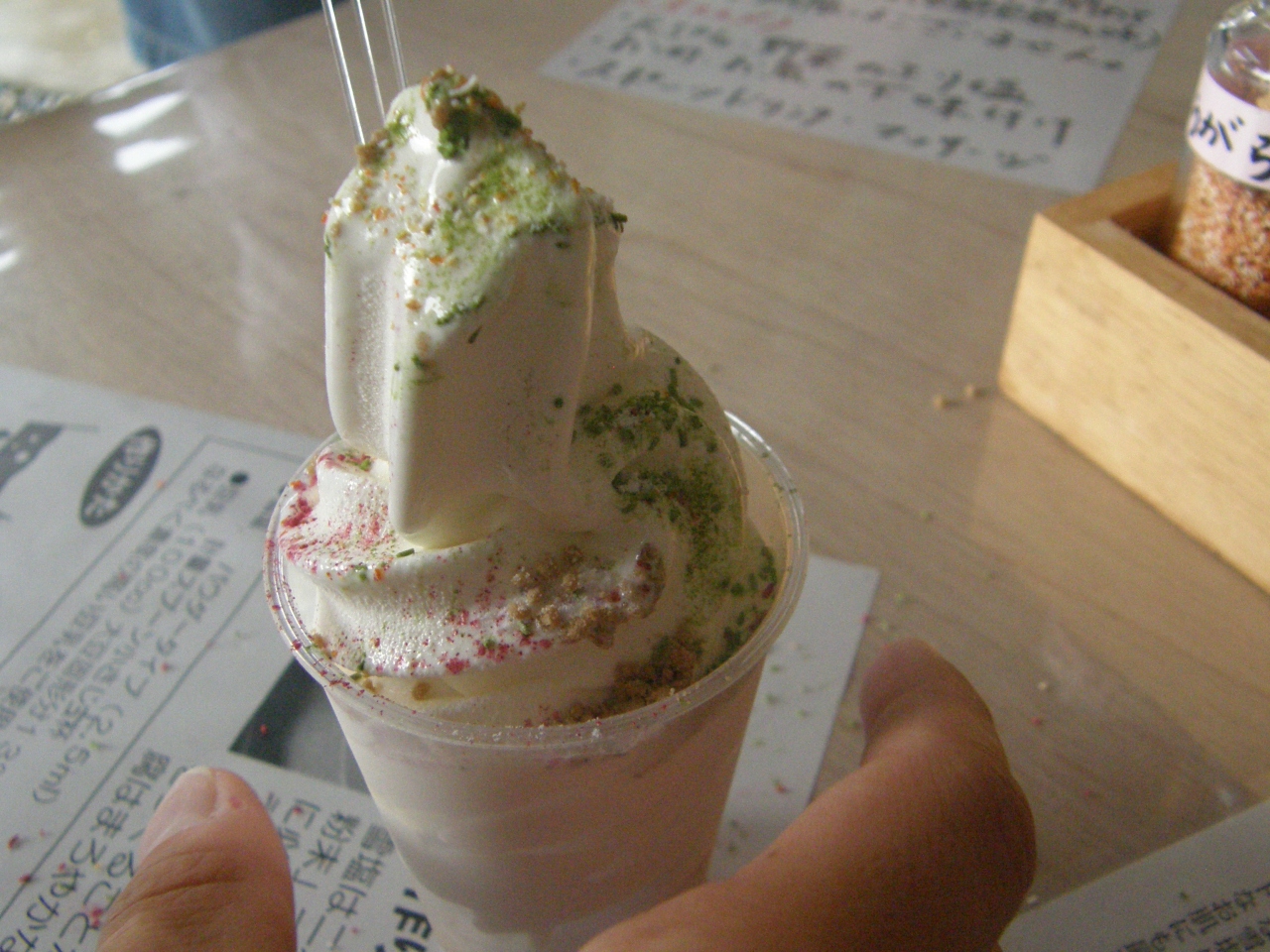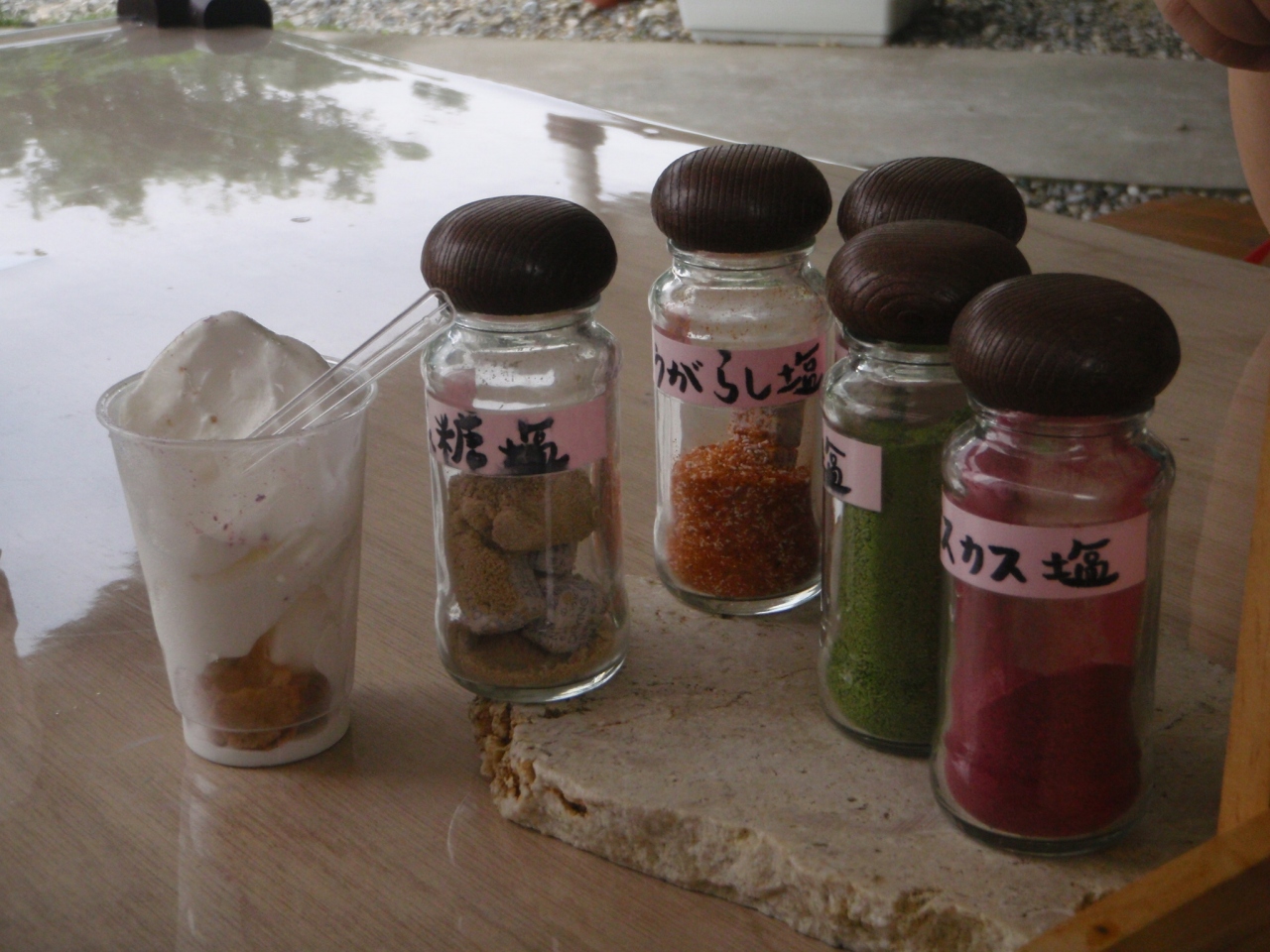 いろいろな味の塩をソフトクリームにつけて食べます
