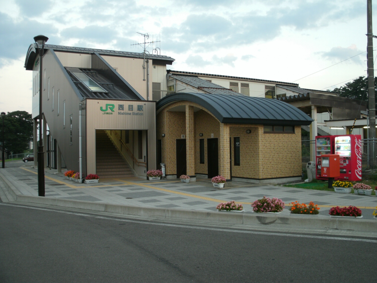 由利本荘市に位置するJR羽越線の駅です。現在は由利本荘市ですが、かつての西目町の中心市街として、駅周辺はにぎやかです。駅舎は新しくて近代的なものになっています。駅構内が広いのは本線の駅らしい姿です。駅の裏手に市役所の支所があります。