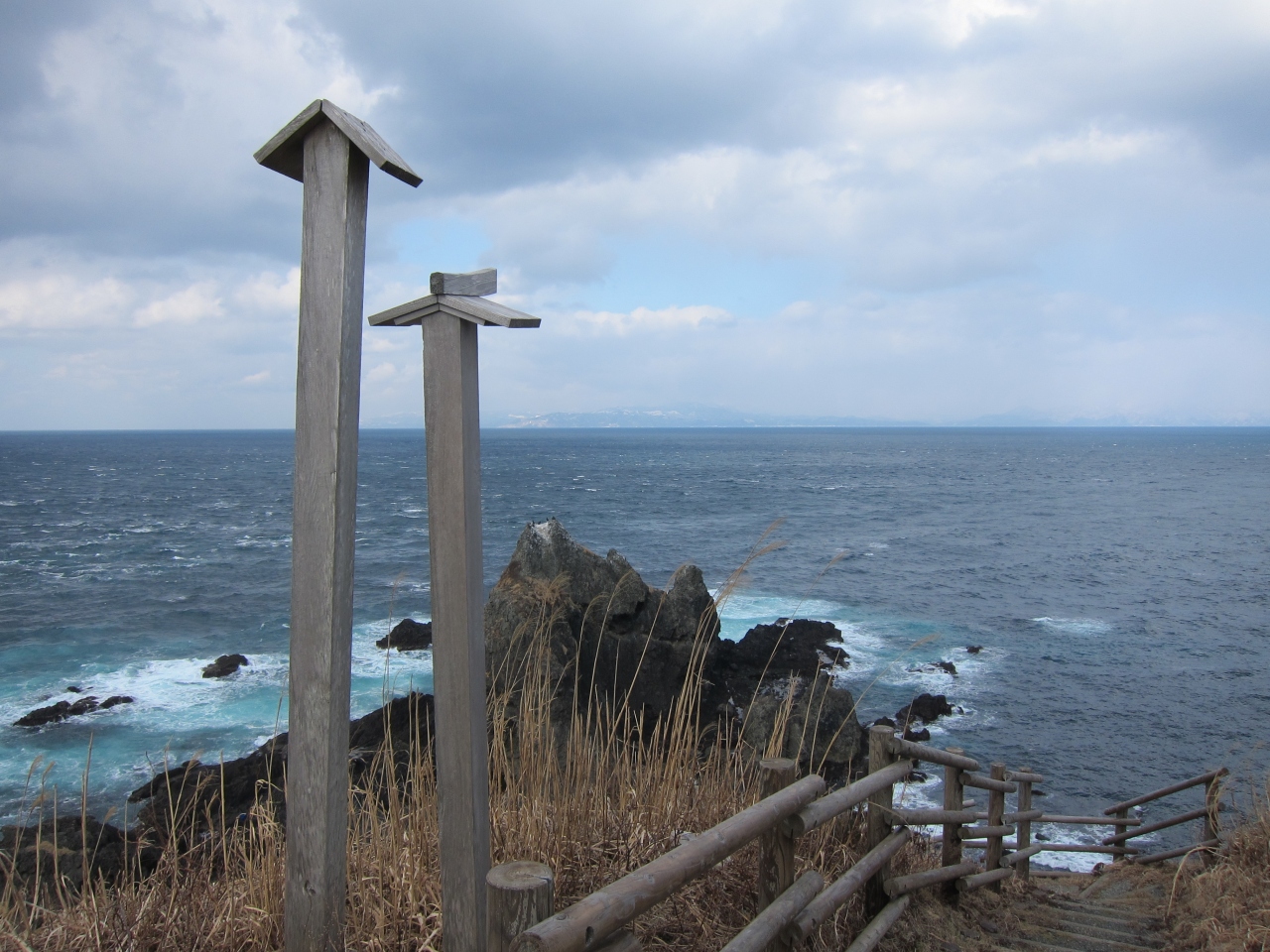 冬の荒れた津軽海峡を期待して行きましたが、天気が悪いと景色が見えず、普通の岩場になってしまうと思います。当日は晴れていたので、対岸の北海道が見えました。バス停から灯台の高台まであがるとモニュメント等があります。バス停から横にそれると階段国道がありますので、何も無い荒涼とした竜飛崎に来たのですから少しでもいろいろ見ておくとよいと思います。