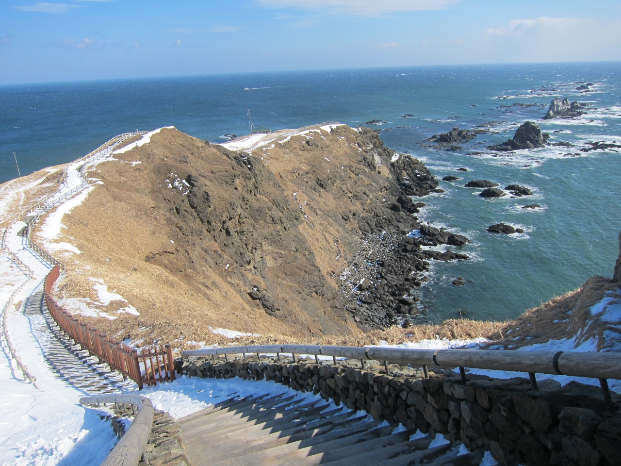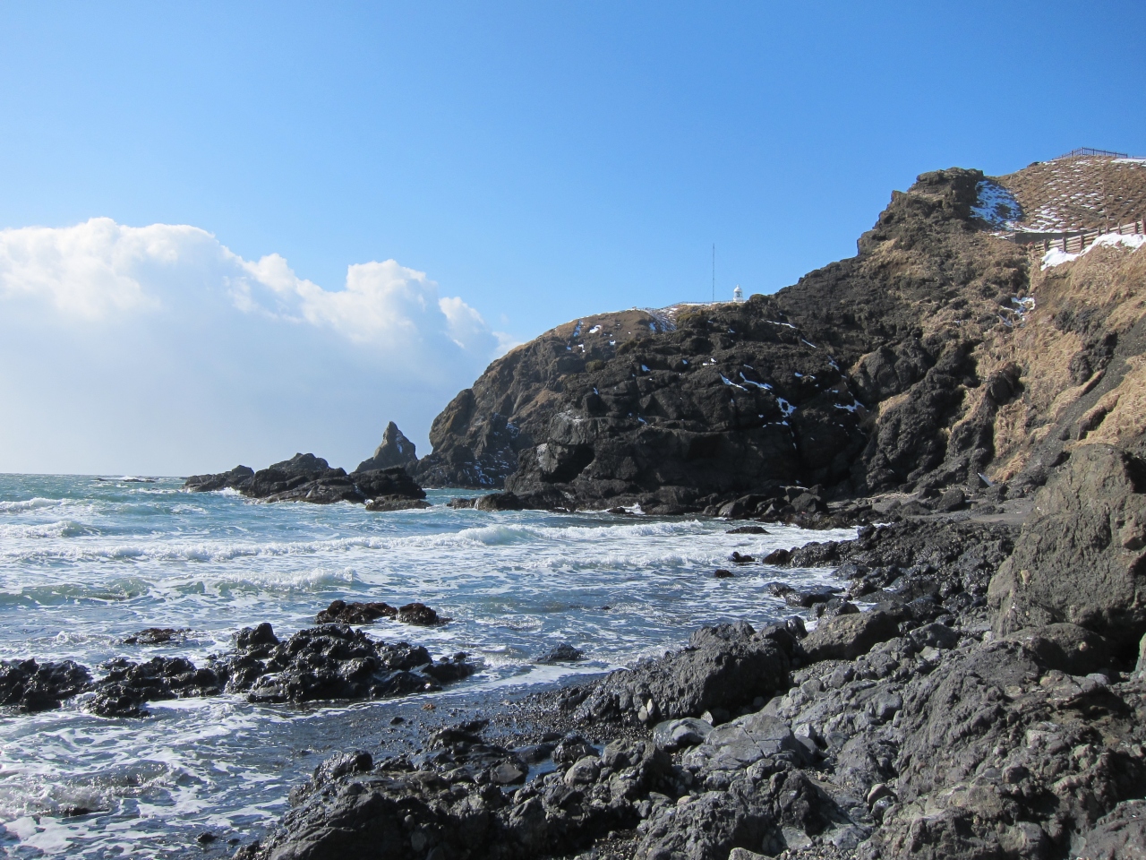 岬の高台を下りると、本当に先端の波打ち際にいくことができます。結構、高低差があります。なお、目の前には海の先の方まで奇岩がそびえ、本当に日高山脈が海の底まで潜り込んでいる様子が感じられます。波打ち際に下りる途中に日高昆布の干し場があるので立ち入らないように注意しましょう。