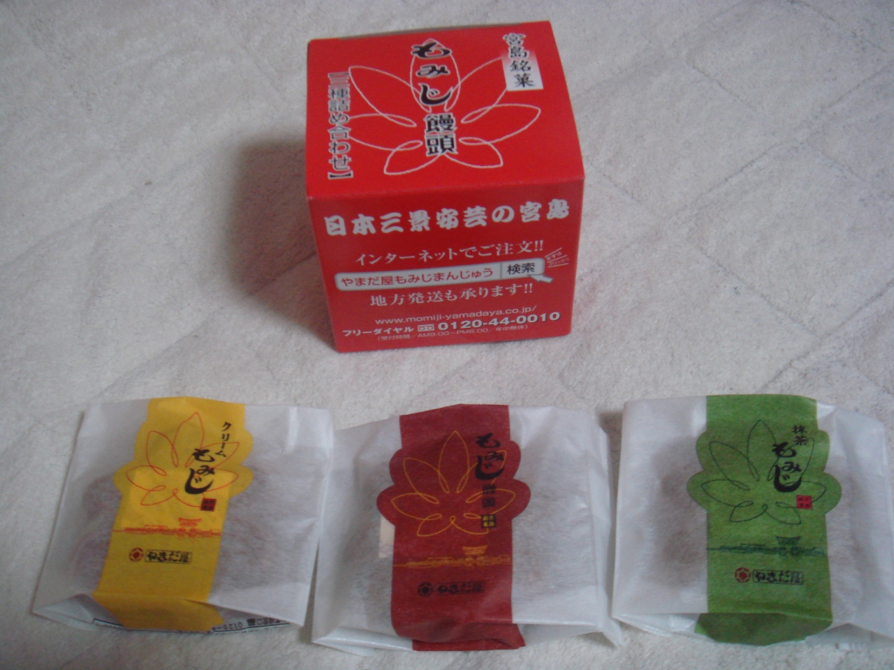 お土産に抹茶、クリーム、こしあんのもみじ饅頭3個も