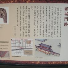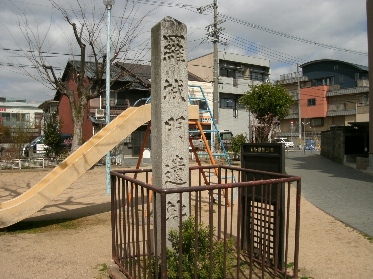 「羅城門跡」は、国道171号線の九条千本にあります。羅城門は、古代、平城京や平安京といった条坊都市の中央を南北に貫いた朱雀大路の南端に構えられた大門で、事実上の都の正門ともいうべき門です。この羅城門跡は、794年(延暦13年)に建設された平安京の正門で、東西4.5キロ、南北5.3キロの京域中央部の南端に羅城門がそびえ、北端の朱雀門と相対していました。門は正面33メートル、奥行8メートルの大きさがあったそうですが、現在では住宅街の奥の小さな公園に、跡地を示す石碑がひっそり残るのみです。芥川龍之介の小説“羅生門”でその名を今に伝えています。羅城門を守護する東西の位置に東寺、西寺が置かれ、今は西寺はありませんが、東寺は現代まで残っています。