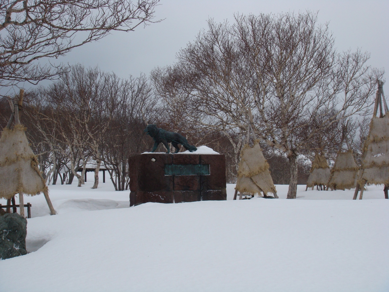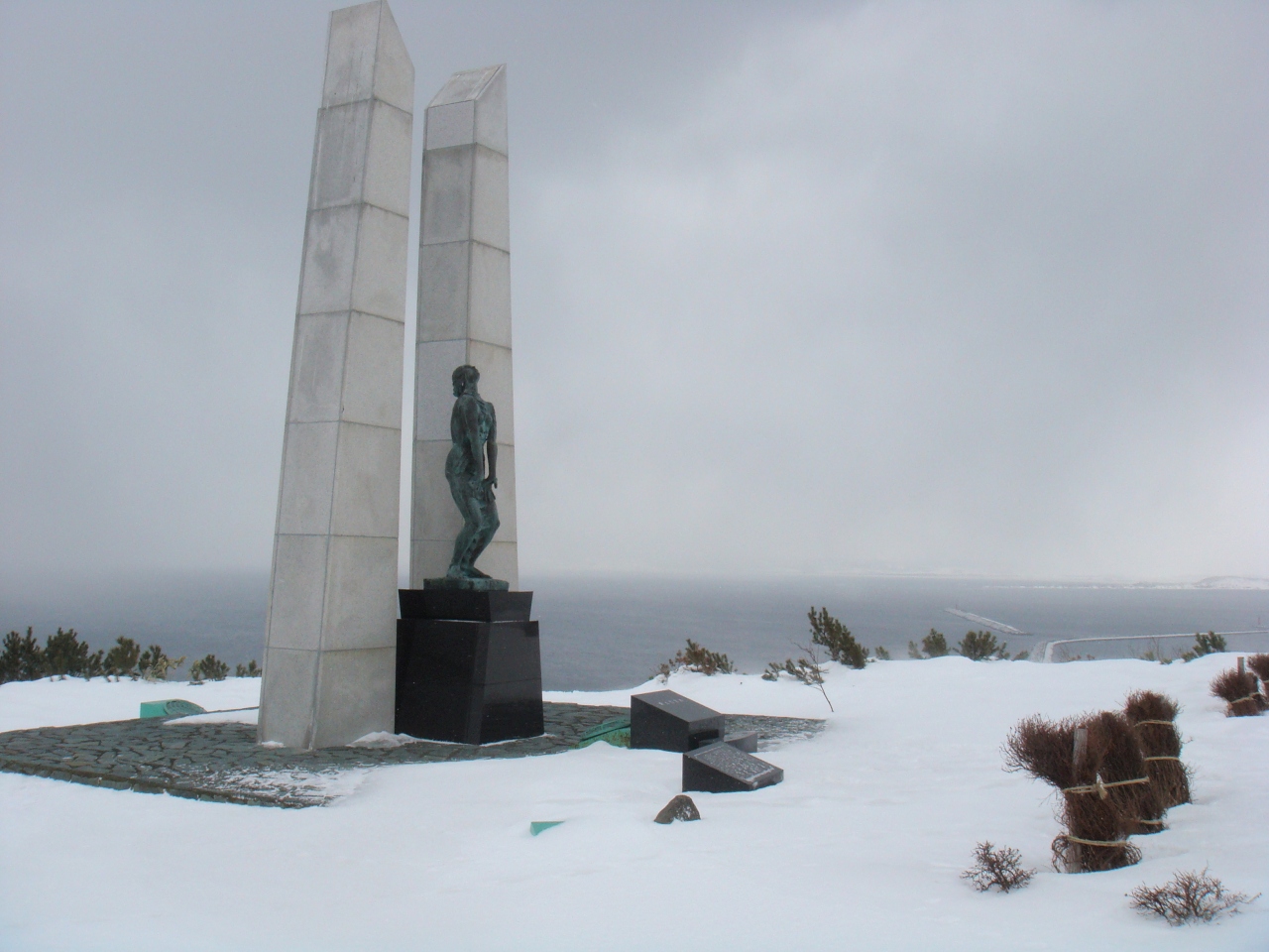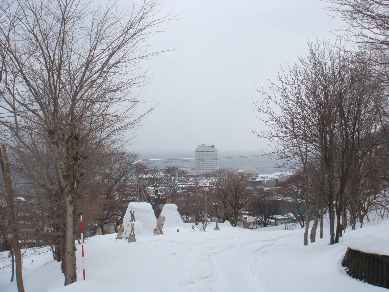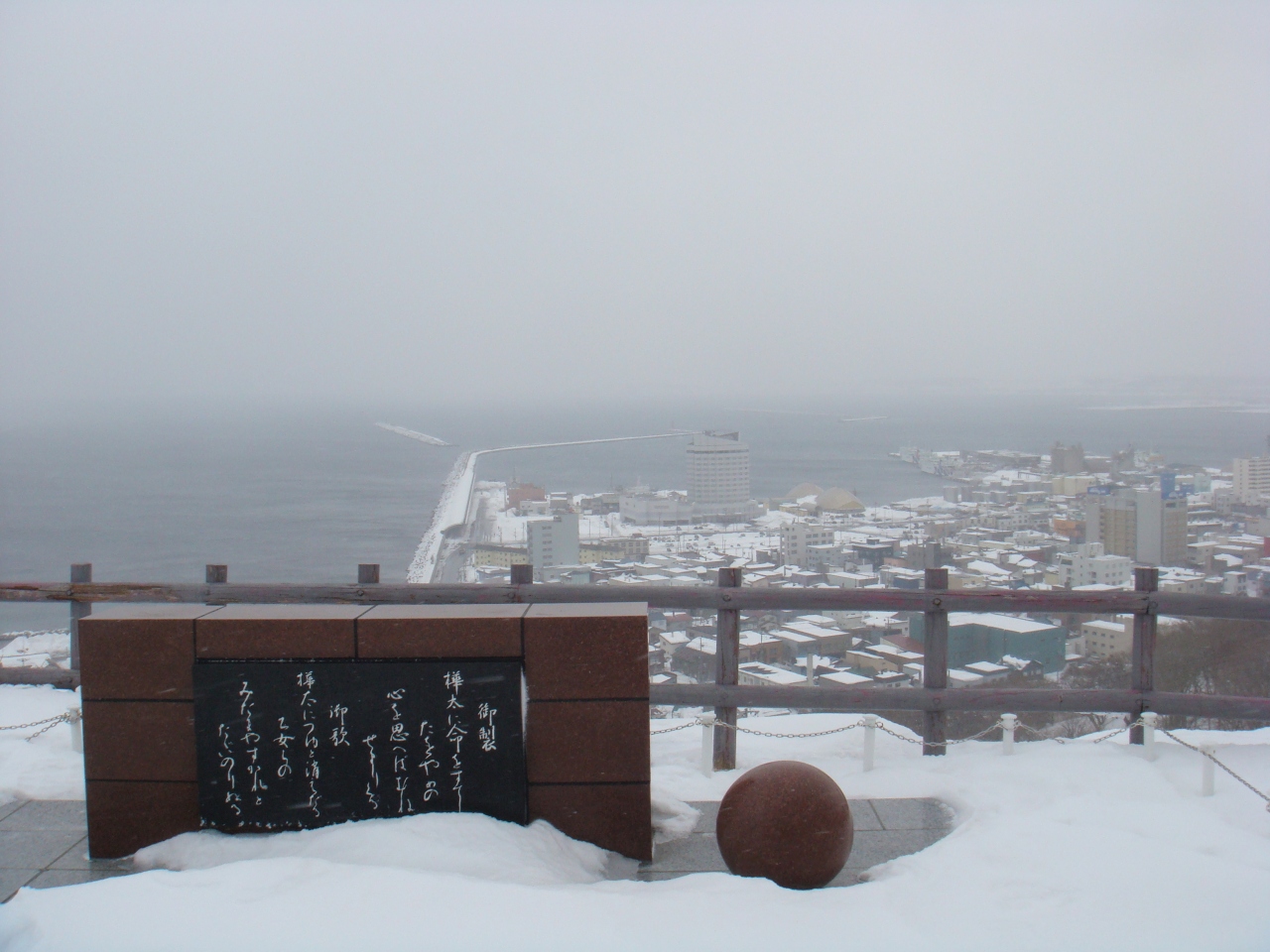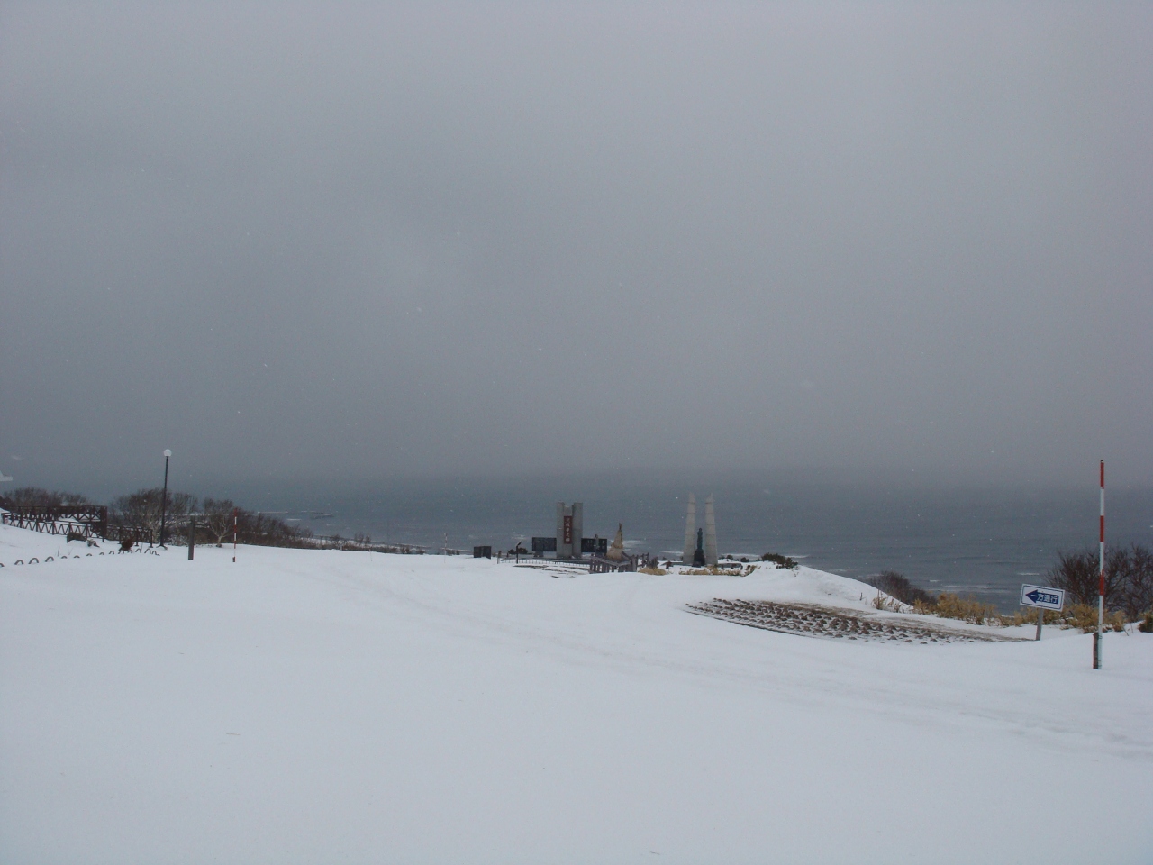 氷雪の門は稚内公園の丘の上にあり、市内を一望することができます。歩いていこうと思えば冬でも行けますが、除雪されている訳でもないので丘の上まで登るのは少しきついです。一部、足が雪にもぐってしまうような所もありました。当日は休憩施設なども閉まっており、付近に人はだれもいません。碑の言われもあり、寂しい雰囲気です。