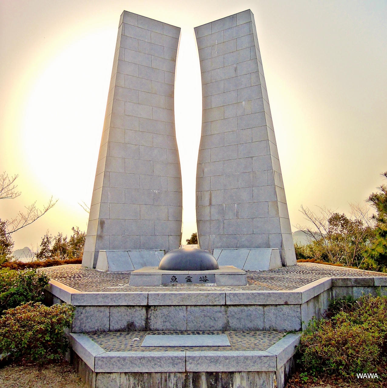 愛媛県西予市三瓶町下泊にある魚霊塔は岬の先端部に建つ美しい石造りの記念碑です。美しい夕陽で有名な宇和海に面していますので、交通は不便ですが訪問を夕方にすれば天気によっては素晴らしい西の空を背景に荘厳な気持ちになれるかも知れません。