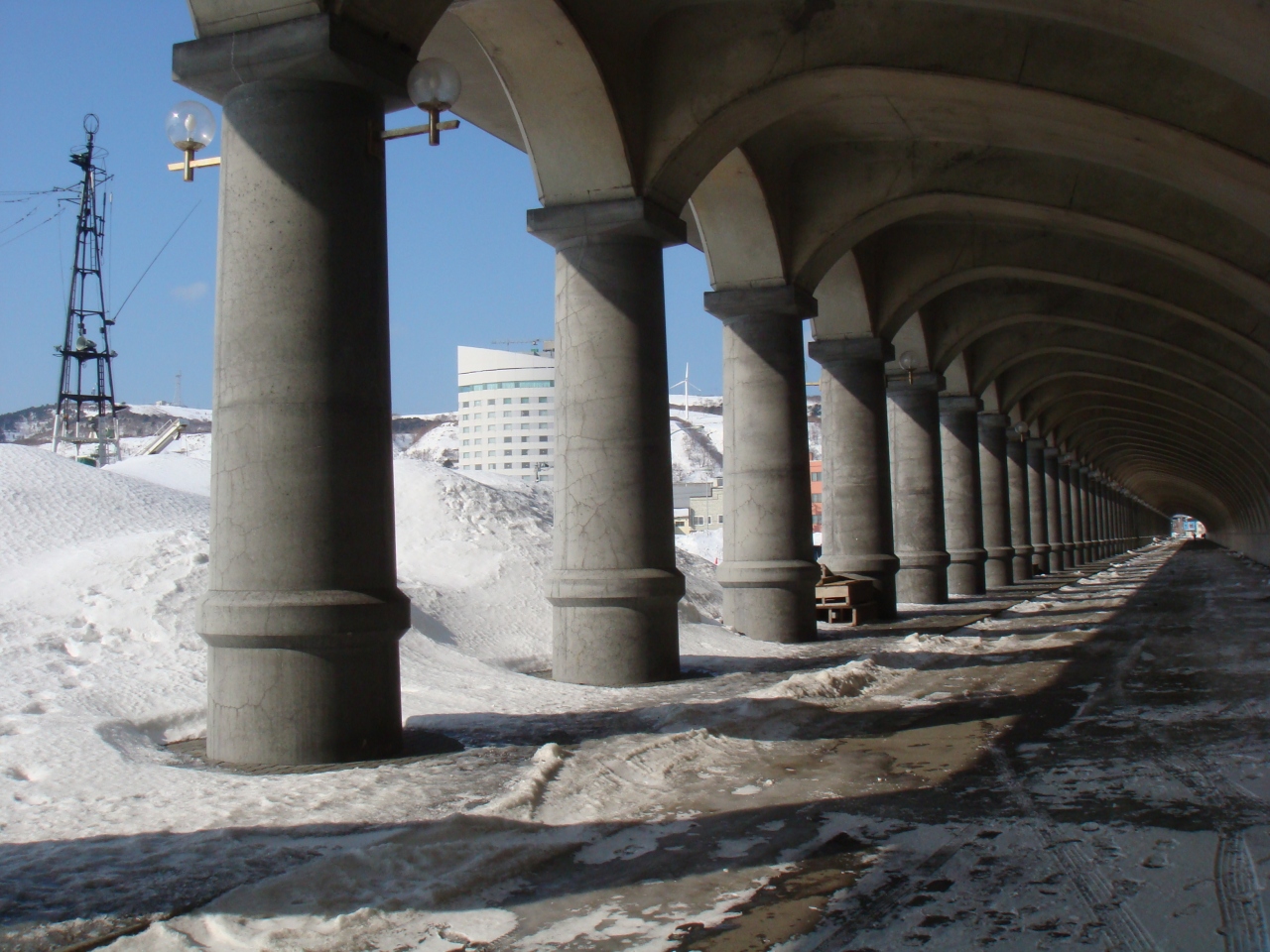 近くで体験したい場合、ドームの始まりのところに堤防の上に上がる階段があり、上からも眺められるみたいです(行きませんでしたが。)。ただ、柵があり、堤防の先までは行けないみたいです。優美な柱の並ぶ堤防の内側と違って、外側は波消しブロックが積みあがっています。