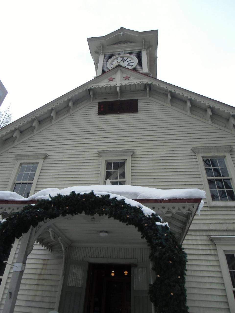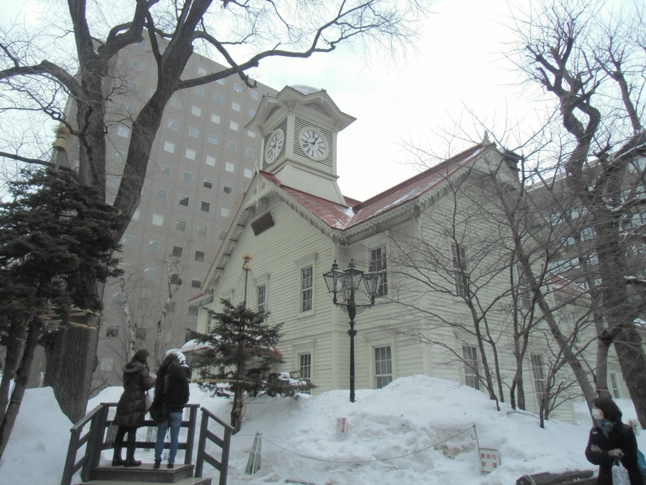 3月の記録的な大雪の中、時計台まで札幌駅から歩いて見物に行きました。5分ぐらいで歩けました。思ったよりは小さな時計台でしたが、三角屋根の上に大時計を載せた特徴的な外観の建築物でした。さすが観光スポットということもあって、記念撮影ができる台もありました。