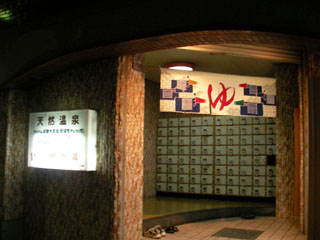 ビルの中でも天井が高いので中に入れば普通の銭湯を同じです。浴室に入ると湖畔から見た富士山のタイル絵が良く見えます。浴槽は二つで、大きい方は白湯で一部が二人分のジェット付きの座風呂で、隣の小さい方が、42度ぐらいの二人ぐらい入れる温泉で、黒湯ではなく黄土色で、炭酸水素イオン(重曹)が入っているので少しすべすべします。脱衣所にはみ出すかたちで、別料金100円のサウナがありますが、水風呂はありませんが、シャワーが1つあります。湯上りに成分表を見ると、わずかに鉄イオンが含まれていて、酸化して黄土色になるようです。