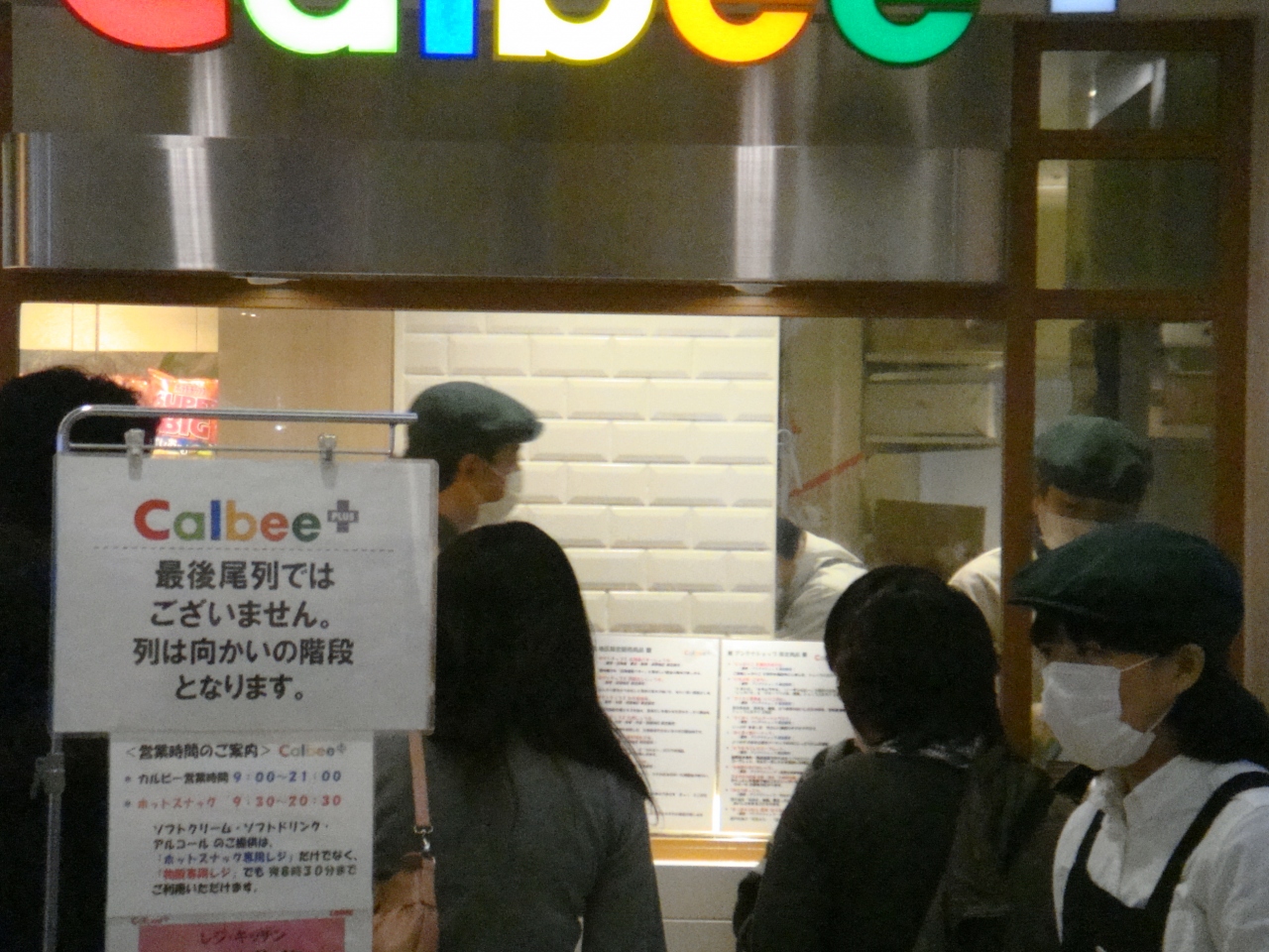 東京駅八重洲口地下にある東京お菓子ランド、日曜日の夕方とあってハッピーターンは30分待ち、カルビーはそんなに並んでいなかったので並ぼうとしましたら、最後列は後ろの階段とのことで、泣く泣く最後尾へ、待つこと15分やっと揚げたてのポテりことロイス風チョコレートソースのポテトチップスを購入、カロリーどんと来い!