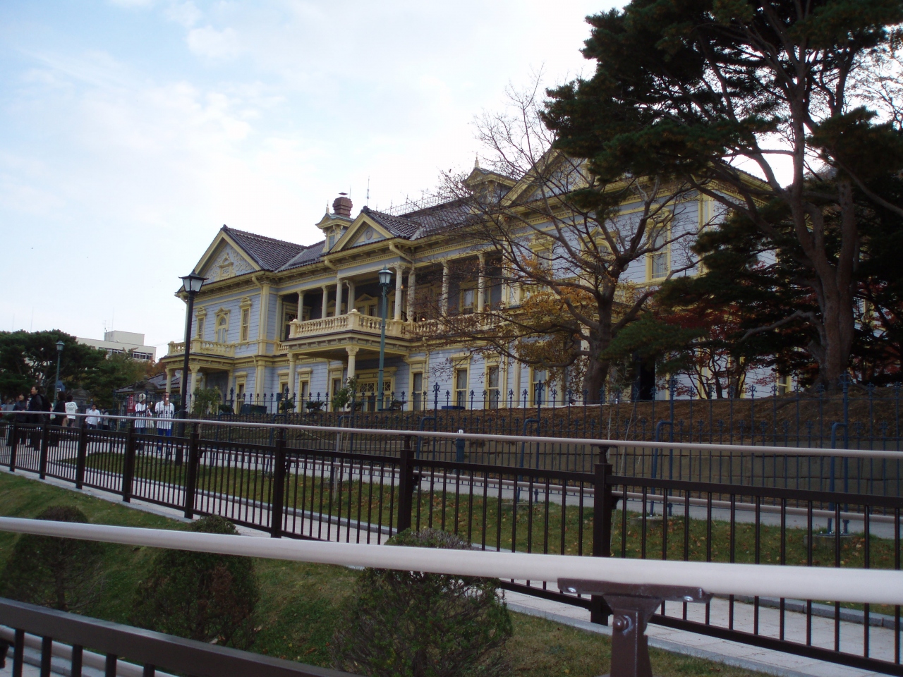 中央にベランダを配し、左右のポーチにもベランダを持ち、ポーチは唐草模様、玄関や回廊を支える円柱の頭に洋風の装飾が綺麗。函館港を見下ろす高台に建つ、ブルーグレーとイエローの色が美しいです。秋の紅葉に映えます。