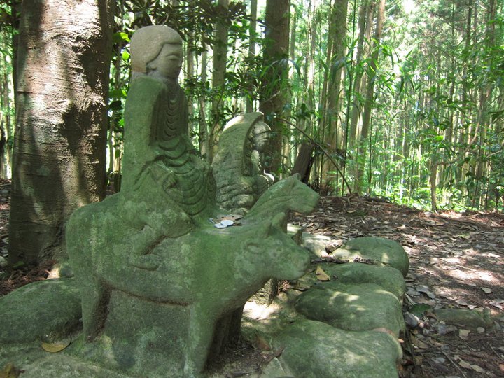 熊野古道の中辺路にあるかわいらしい石像です。高さ50cm程度の小さな石像です。石造の周りには小銭がたくさん撒かれていました。賽銭でしょうか。熊野古道の途中にあり、石像のまわりをぐるっと周ってまた熊野古道に戻れます。
