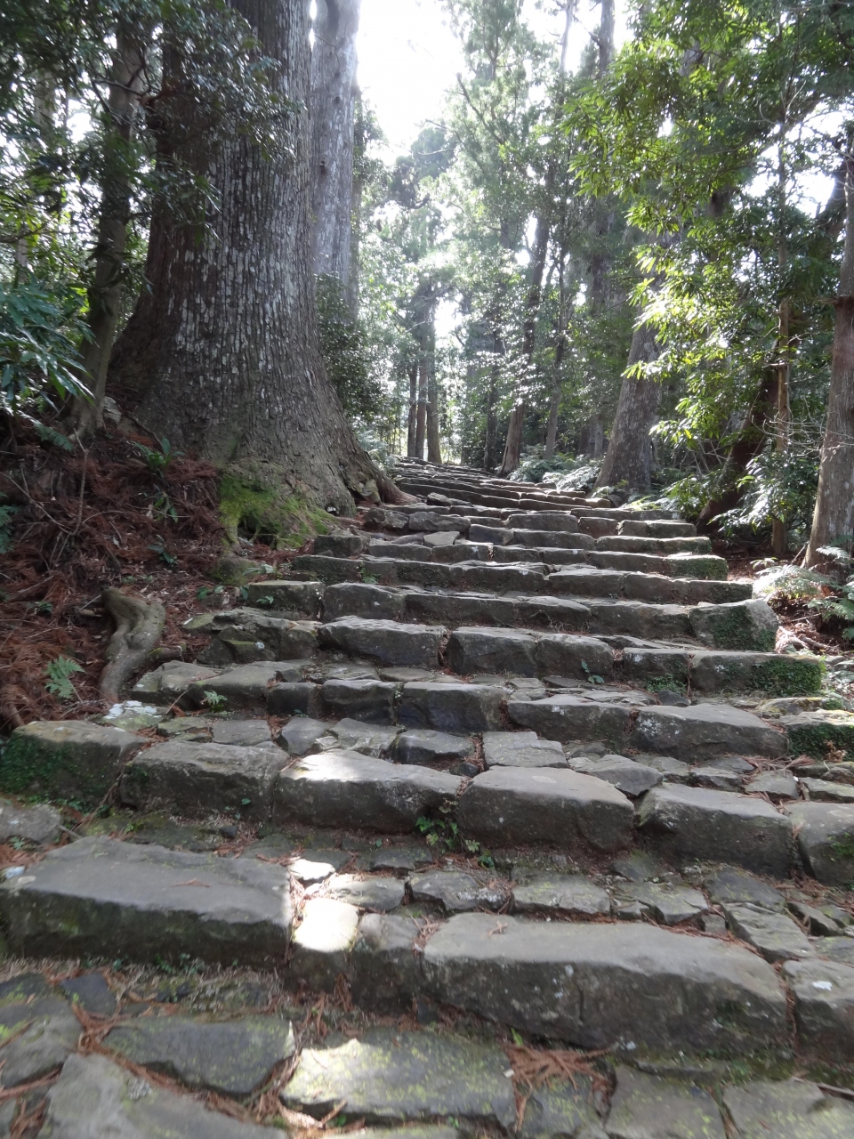 熊野古道大門坂から那智大社を目指し歩きました。初心者向けとなっていたので、最初から結構なスピードで歩いてしまい、まぁ大変でした!!木々の中を歩くのはとても気持ちいいのですが、石畳の階段は段差が違ったりで上るのはかなりきつかったです。甘くみるとダメです。上りきっても、那智大社に行くにはまた階段が400段以上あるのでこれまた大変でした。