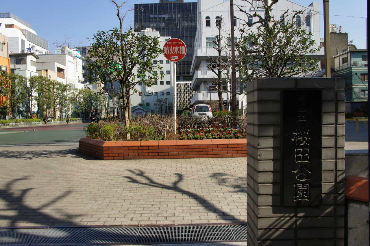 桜田公園は、新橋駅近くの街中公園。もとは学校だった場所を公園にしたもので、アスファルトのトラックとか、本当に当時のまま。それを何とも思わずに、けっこう近所の人が休んでいたりして。そんなことにかまっていられない。いかにも都会の風景だなあとちょっと感心しました。