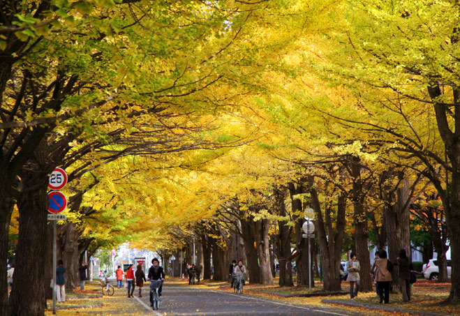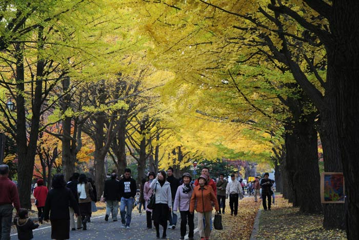 黄色く色付いた銀杏並木を楽しむために多くの市民が訪れます。