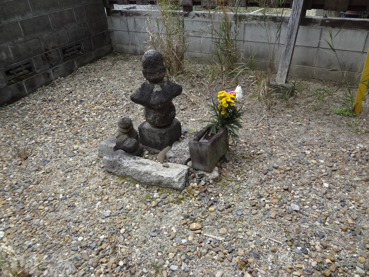 気をつけて探さないと見落としてしまいそうな細い道を入ると、建物の裏側にひっそりと頼風塚はあります。昔、小野頼風と深い仲にあった女性が、彼の足が遠のいたのを恨み悲しみ入水し、そのあとを頼風も追ったといわれ、それを哀れんだ人々が塚を築いたそうです。この頼風塚は男塚とも呼ばれ、女塚は松花堂庭園にあります。