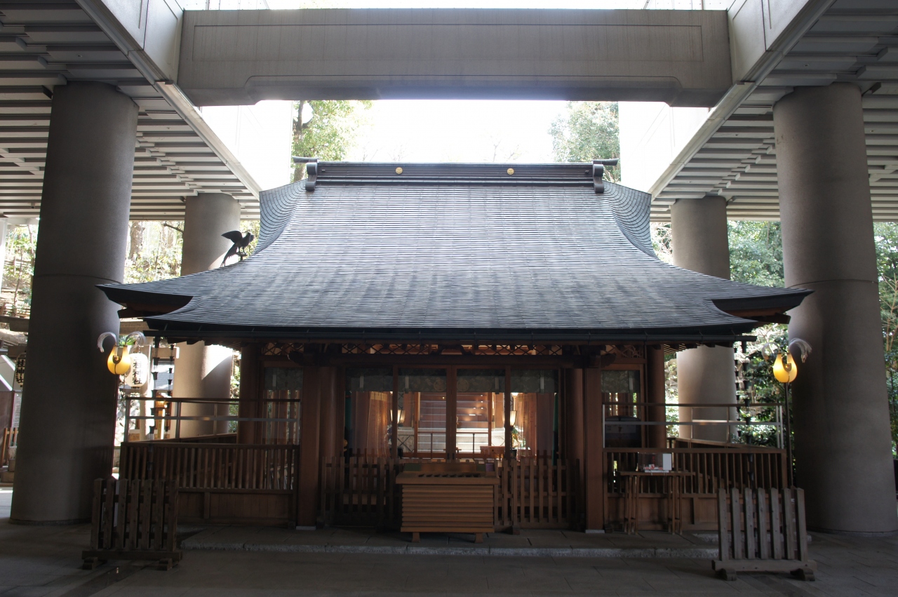 名前が変わっていますが、これは、徳川三代将軍家光にまつわるもの。徳川家光が鷹狩りに来た時、一羽の白雉が社地に飛び入ったのを稀なめでたいしるしとして、家光から「以後雉子宮と称すべし」との言葉があって、「雉子ノ宮」と改称したのだそうです。大きなビルの間のスペースにうまく収まった本殿があって、いかにも都会の神社です。
