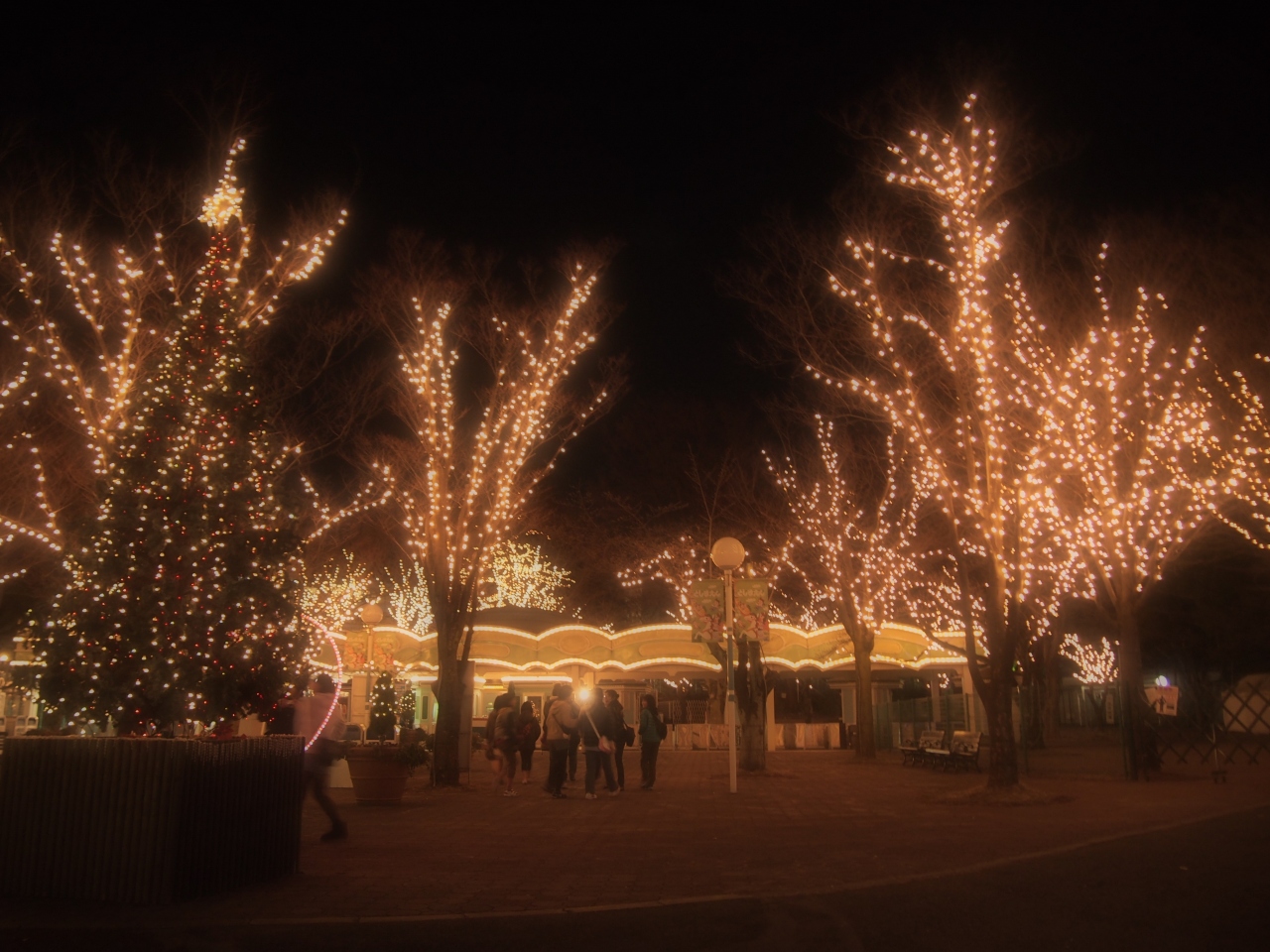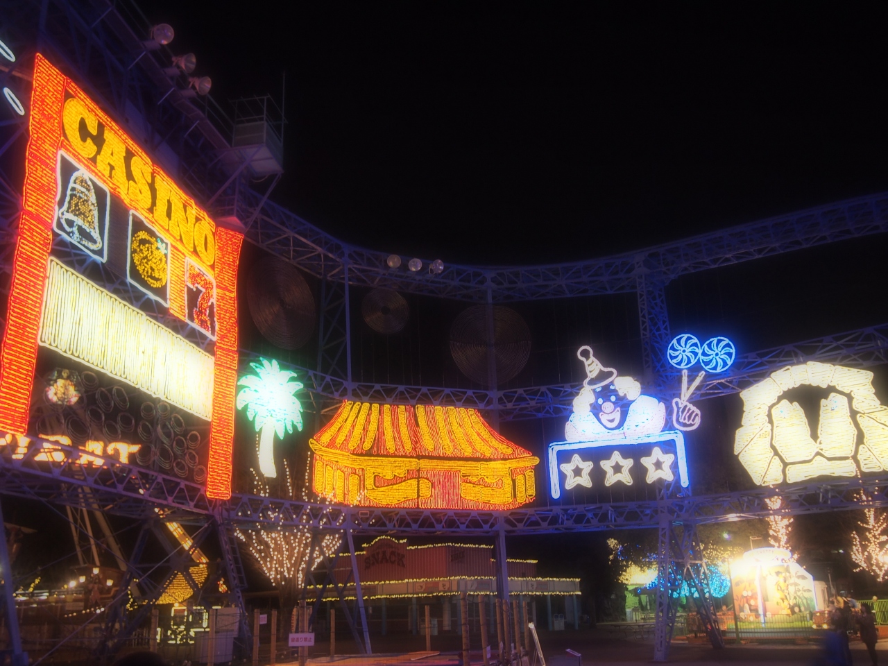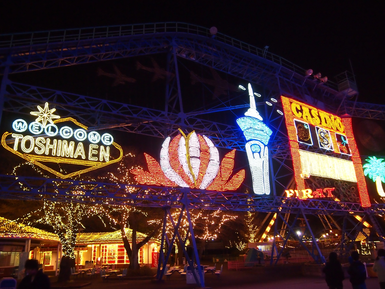 としまえんでは、お客さんを呼ぶために、期間限定で季節ごとにコンセプトを決めて色々と趣向を凝らしたイルミネーションなどをやっているようですが、それだけを期待して来ると後悔しますので(汗)、イルミネーションはおまけ程度に考えた方が良いかも。 期間限定(この冬はラスベガスがコンセプトでしたが)のイルミネーション以外でも、夜遅くまで営業している週末は、遊園地全体がイルミネーションでキレイで、アトラクションもいくつかは暗くなっても営業してます。 昼間は子供だましで全然怖くない絶叫マシンも、真っ暗な中だと怖さ倍増かも!?